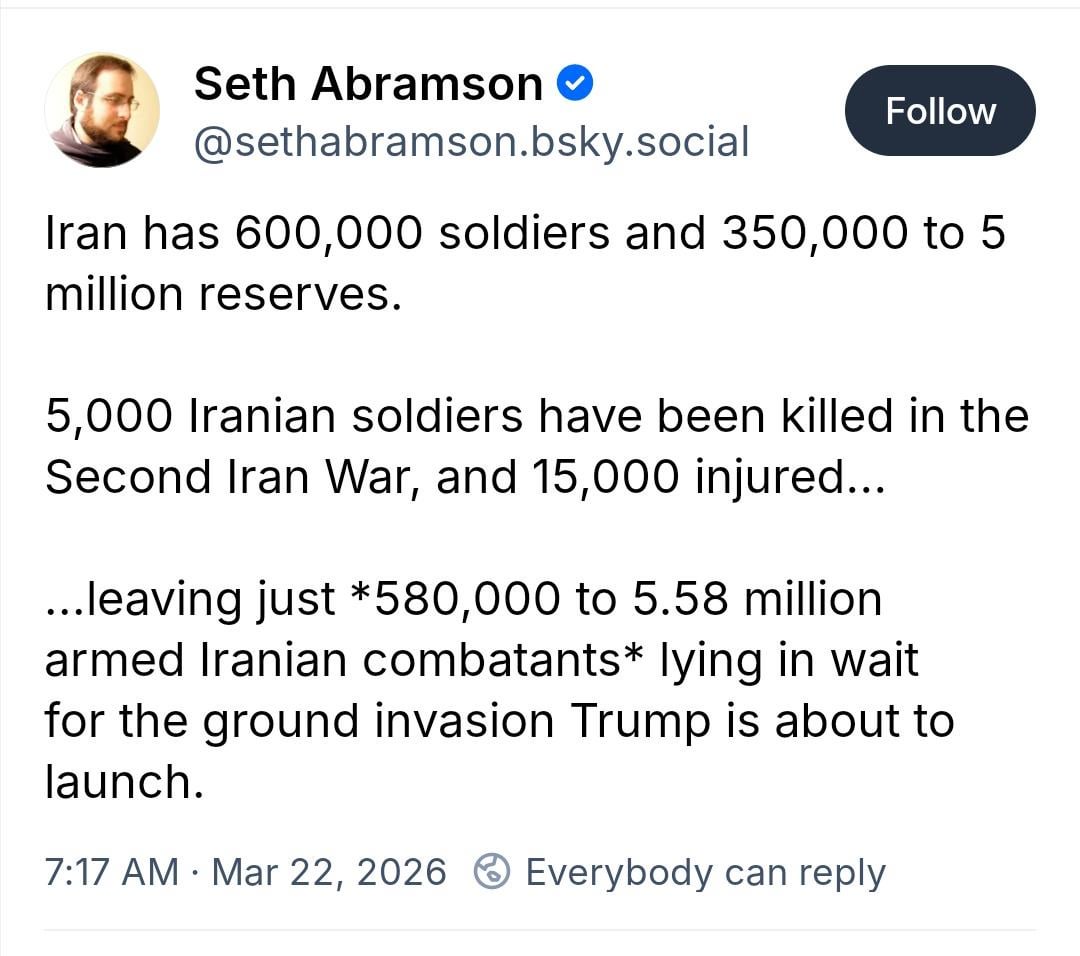 Leaving 5.58 million armed Iranians waiting for Trump’s invasion — AbramsonLeaving 5.58 million armed Iranians waiting for Trump’s invasion — Abramson0 Comments 0 Shares 514 Views 0 Reviews