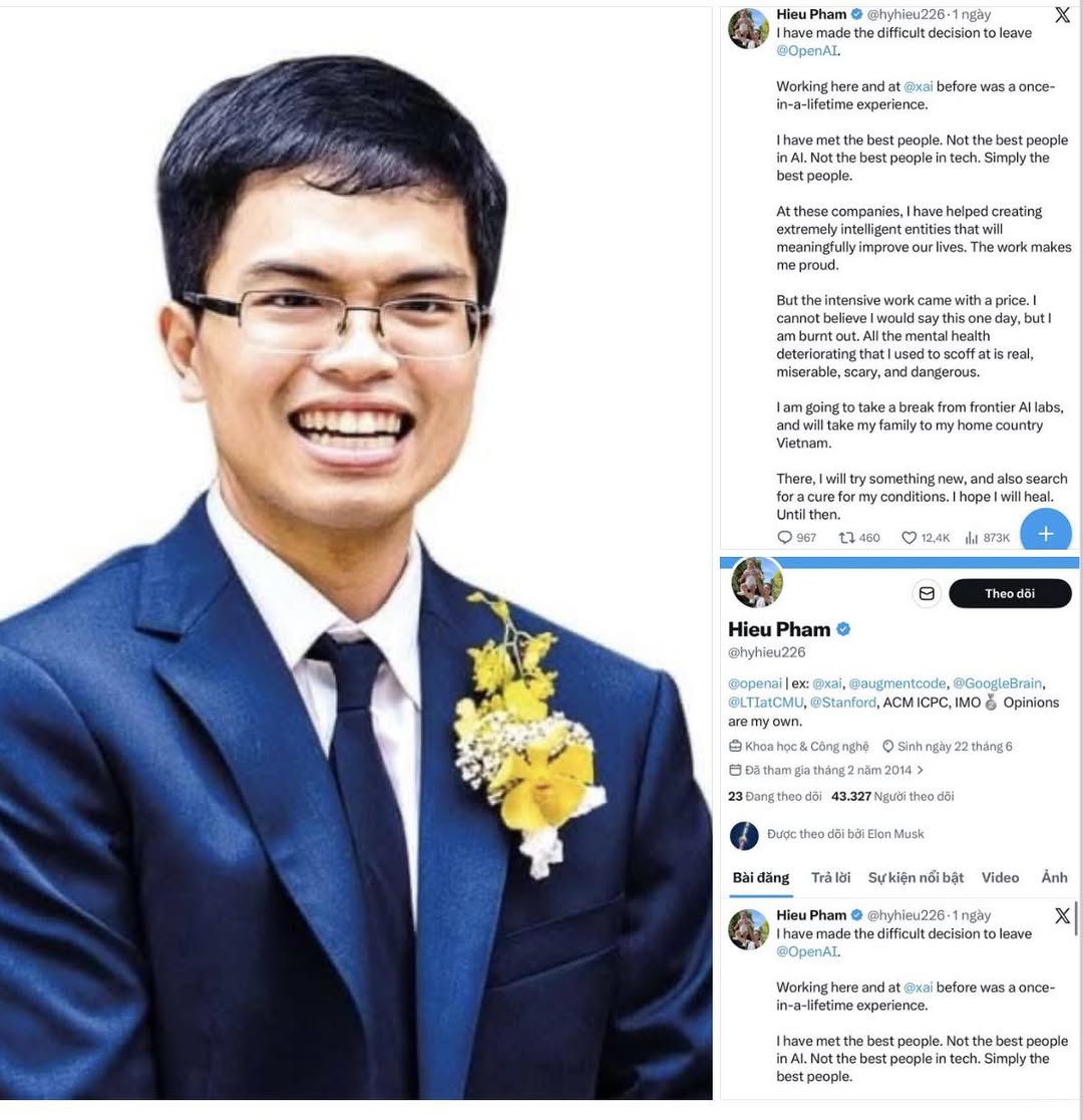TS. Phạm Hy Hiếu, nhà khoa học người Việt từng làm việc tại xAI của Elon Musk rồi chuyển sang OpenAI, vừa thông báo rời bỏ vị trí tại phòng thí nghiệm AI hàng đầu thế giới. Lý do anh đưa ra là kiệt sức và sức khỏe tâm thần suy giảm nghiêm trọng