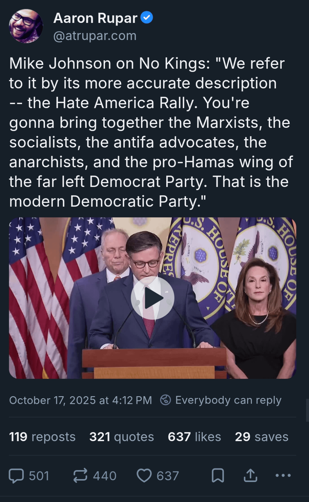Mike Johnson on No Kings: "We refer to it by its more accurate description -- the Hate America Rally. You're gonna bring together the Marxists, the socialists, the antifa advocates, the anarchists, and the pro-Hamas wing of the far left Democrat Party. That is the modern Democratic Party."