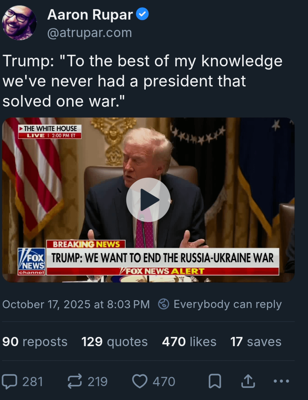 Trump: "To the best of my knowledge we've never had a president that solved one war."