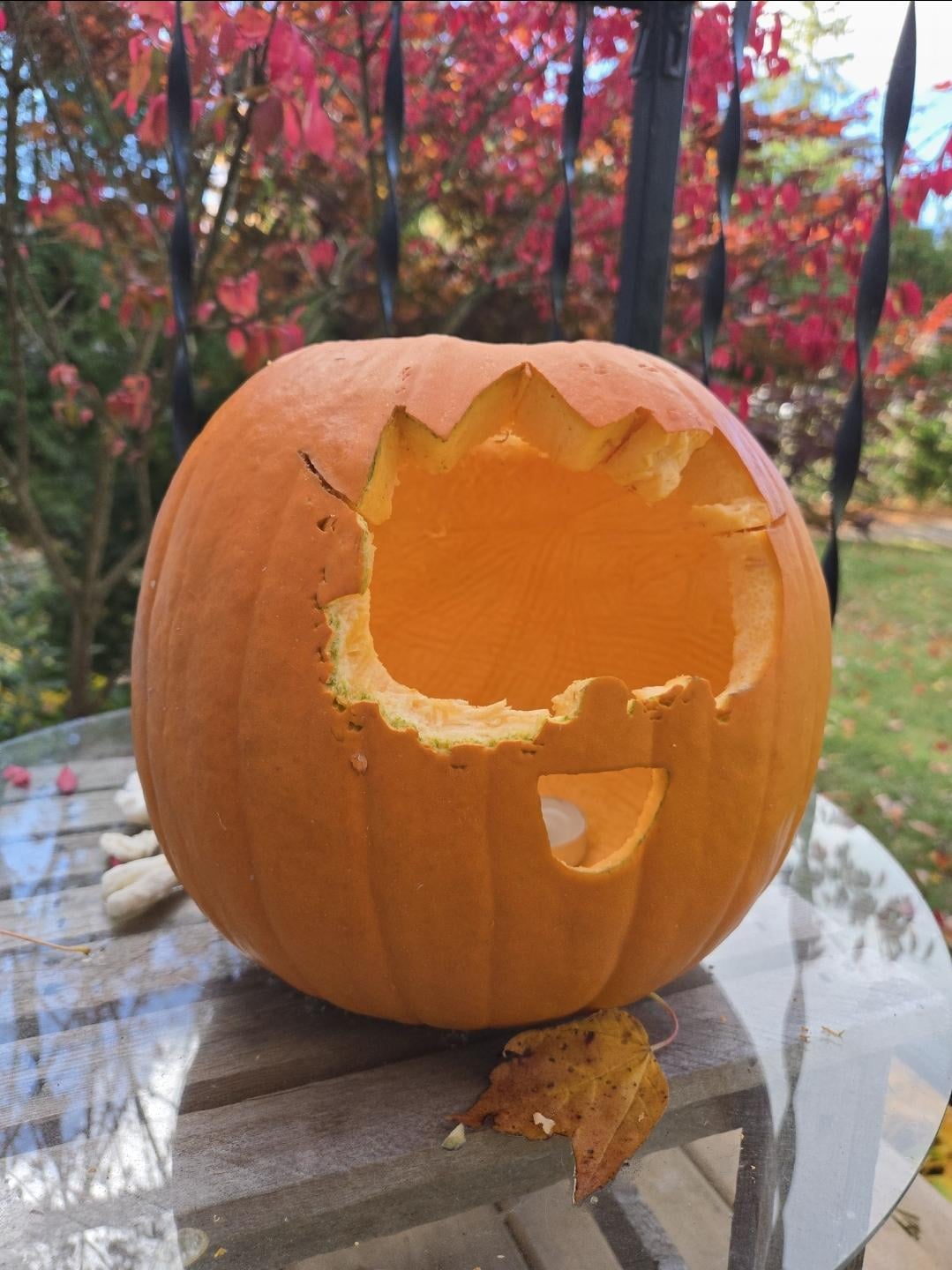 My pumpkin had its face eaten, but at least it's happy about it