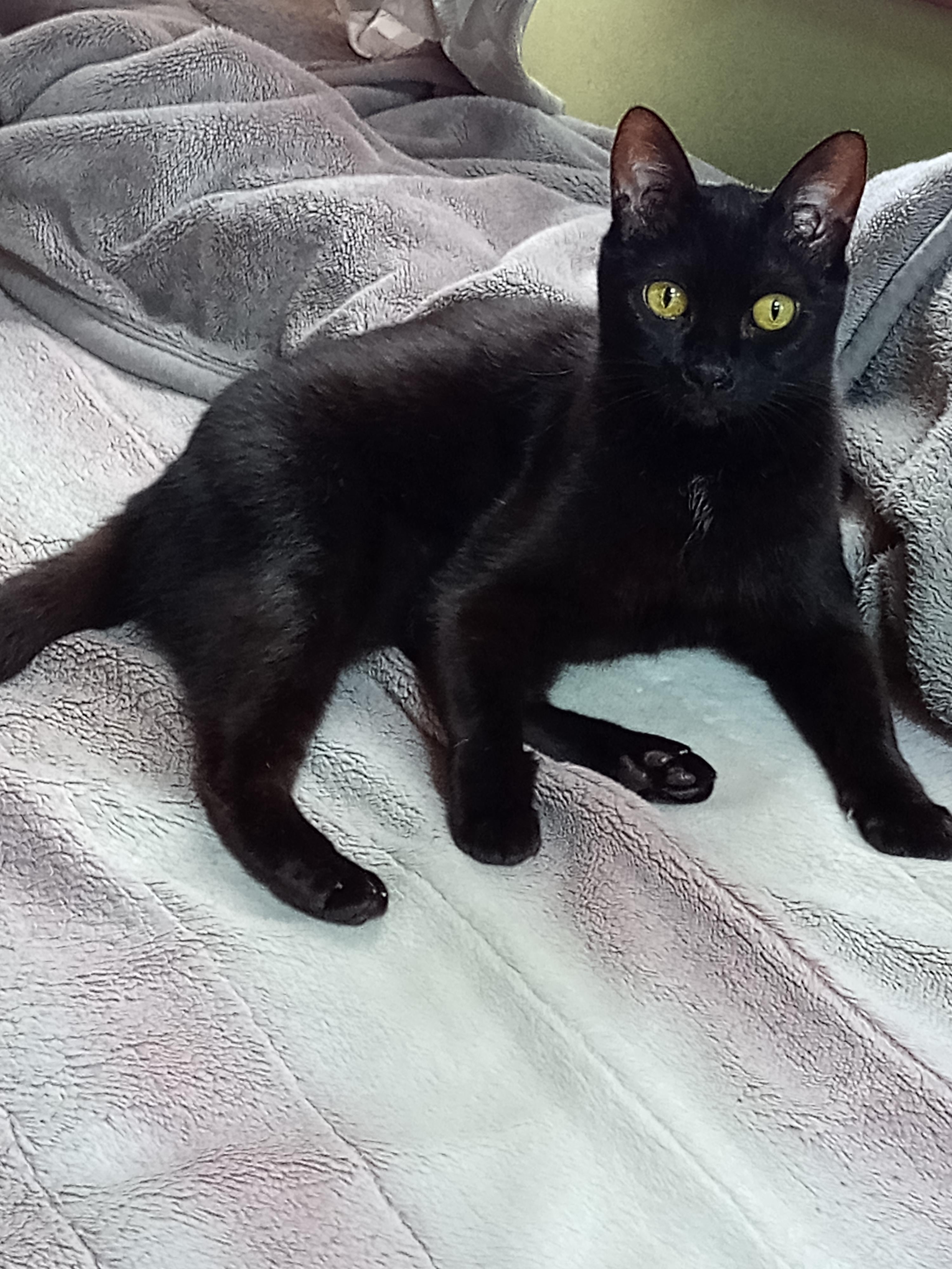 Momo the black cat, golden gaze.