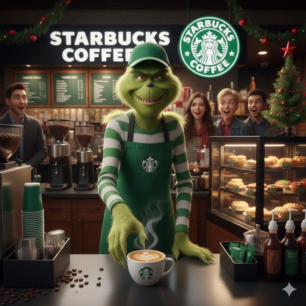 The Grinch serving Starbucks coffee