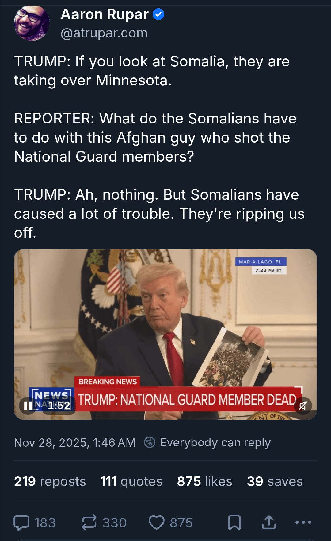 I don’t remember Somalis violently storming the U.S. Capitol building to overthrow the results of a U.S. election, but that’s just me.