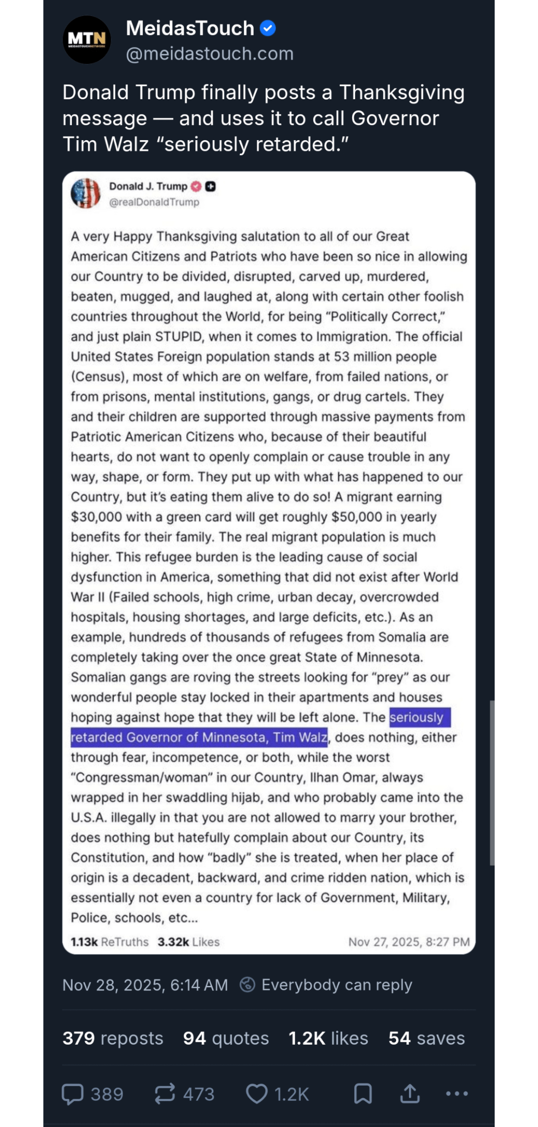 So, uses a slur against Tim Walz, then utters a racial slur against Rep. Omar's clothing. Then, to top it off, he insinuates that she married her brother? What an absolutely disgusting, vile, putrid excuse of a human being he is. Don't forget that Walz has a special needs son.