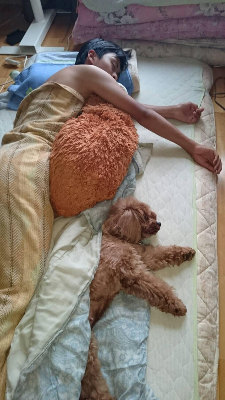 My love came and copied me when I was sleeping long years ago. My mom took a photo.