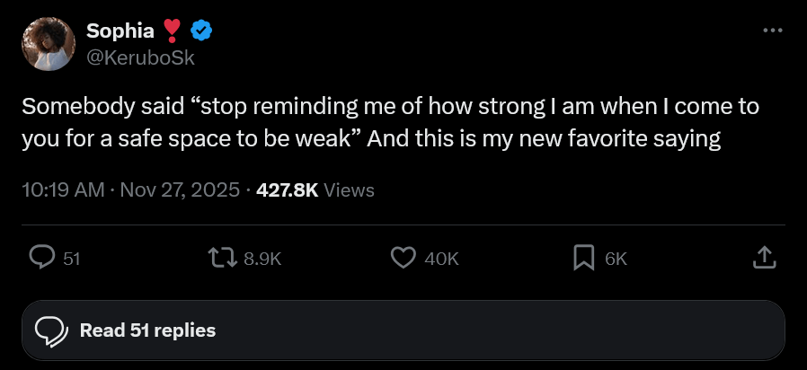 “stop reminding me of how strong I am when I come to you for a safe space to be weak” I like this phrase a lot