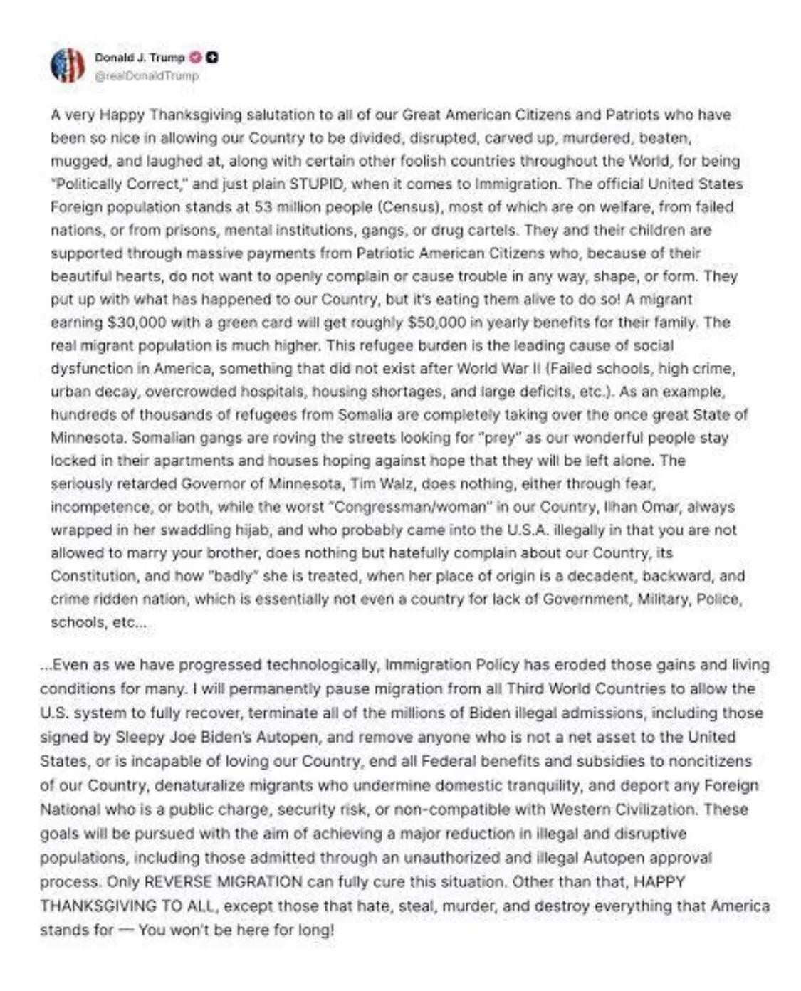 Petty, unadulterated racism from the US president in a thanksgiving post.
