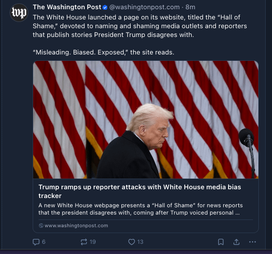 The White House launched a page on its website, titled the “Hall of Shame,” devoted to naming and shaming media outlets and reporters that publish stories President Trump disagrees with. “Misleading. Biased. Exposed,” the site reads.