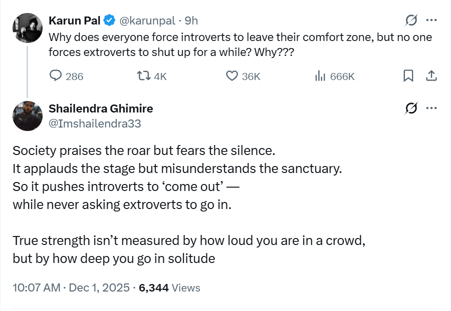 Society praises the roar but fears the silence. It applauds the stage but misunderstands the sanctuary. So it pushes introverts to ‘come out’ — while never asking extroverts to go in. True strength isn’t measured by how loud you are in a crowd, but by how deep you go in solitude