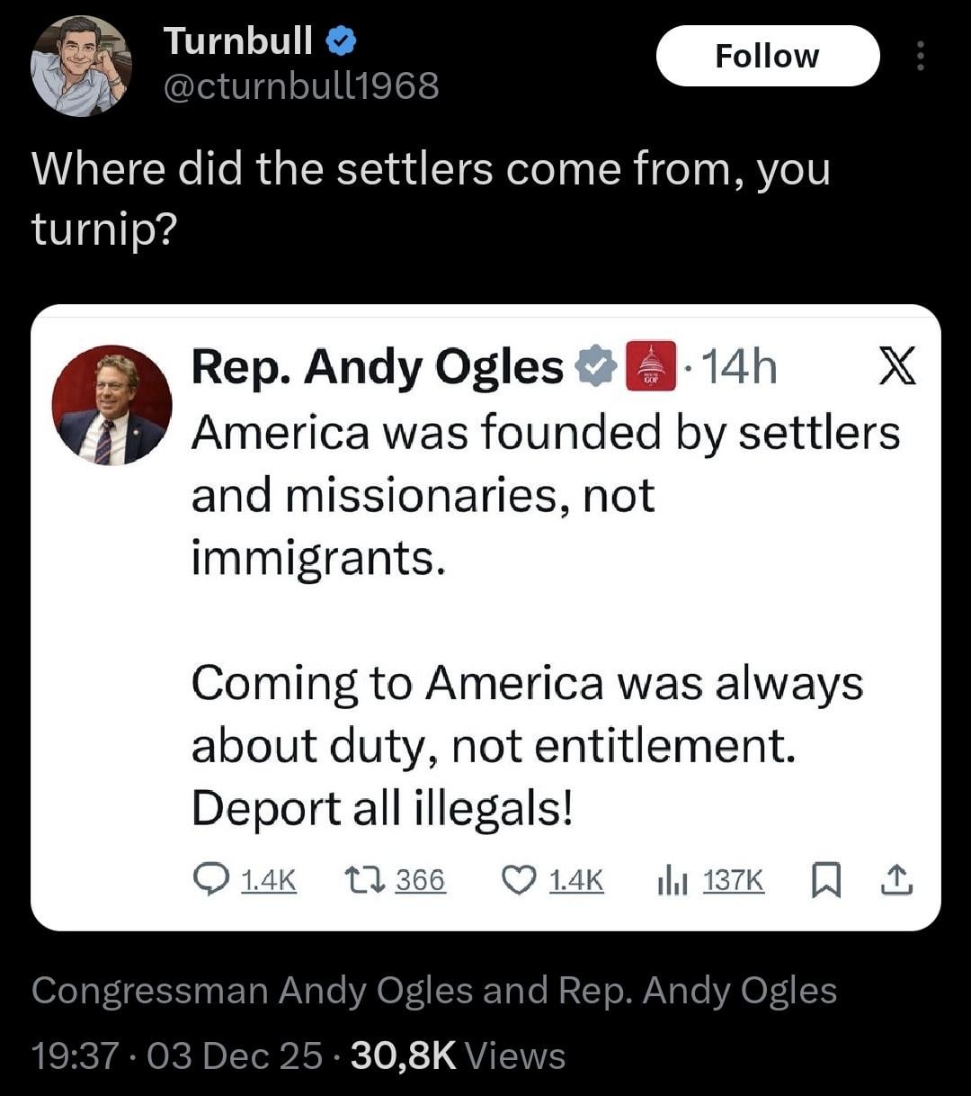 Framing "us and them" by distinguishing between settlers and imigrants - there were people in the US before Europeans...