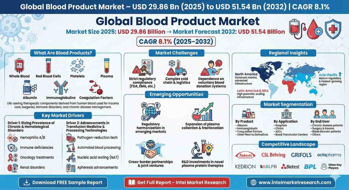 Global Blood Product Market: USD 29.86 Billion in 2025 → USD 51.54 Billion by 2032 (CAGR 8.1%)