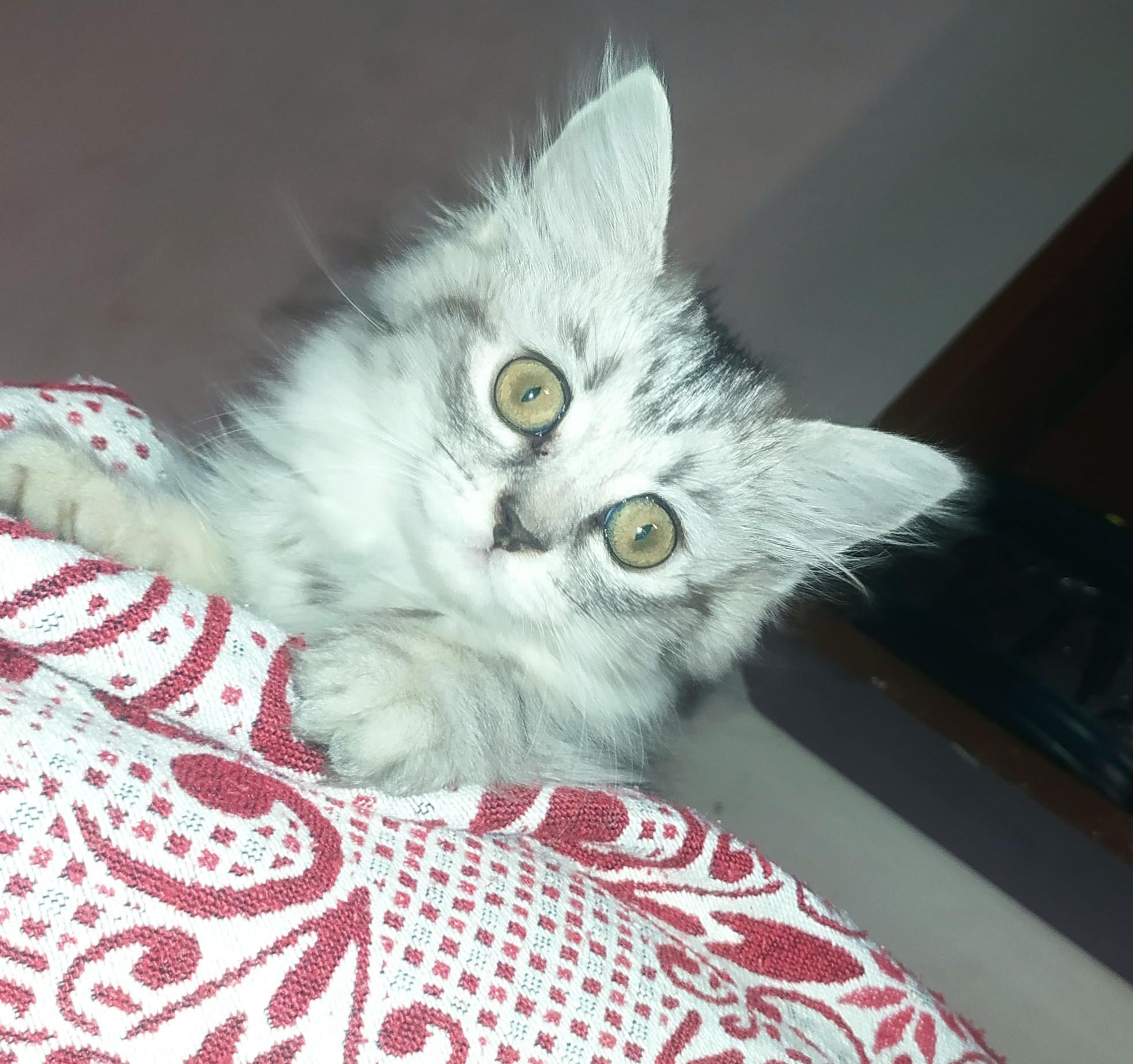 Fiance found him crying by himself in our neighborhood when he was the size of my hand. He still a baby. Maoww.