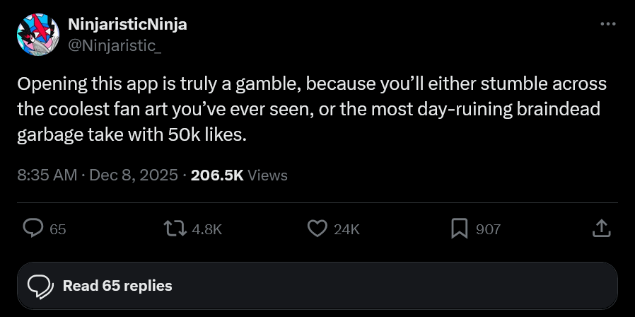 Opening this app is truly a gamble, because you’ll either stumble across the coolest fan art you’ve ever seen, or the most day-ruining braindead garbage take with 50k likes.