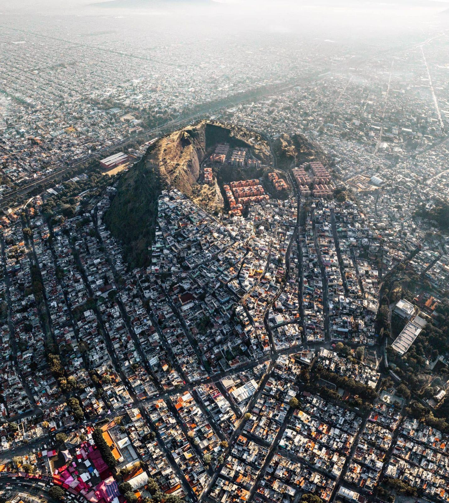 The Tepepolco volcano in Mexico City. Dormant for over 10,000 years, its crater is now a unique residential neighborhood.