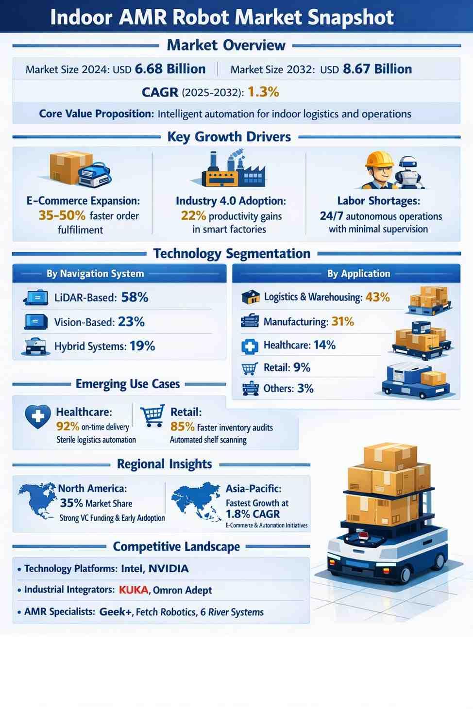 Indoor AMR Robot Market Outlook (2025–2032) | CAGR 1.3% global Indoor Autonomous Mobile Robot (AMR) market is experiencing steady growth as industries accelerate automation to overcome labor shortages and efficiency challenges. Valued at USD 6.68 billion in 2024, the market is projected to reach USD 8.67 billion by 2032, driven by rising adoption across logistics, manufacturing, healthcare, and retail. Advanced navigation technologies such as LiDAR, computer vision, and AI-powered SLAM are transforming indoor material handling and operational workflows.