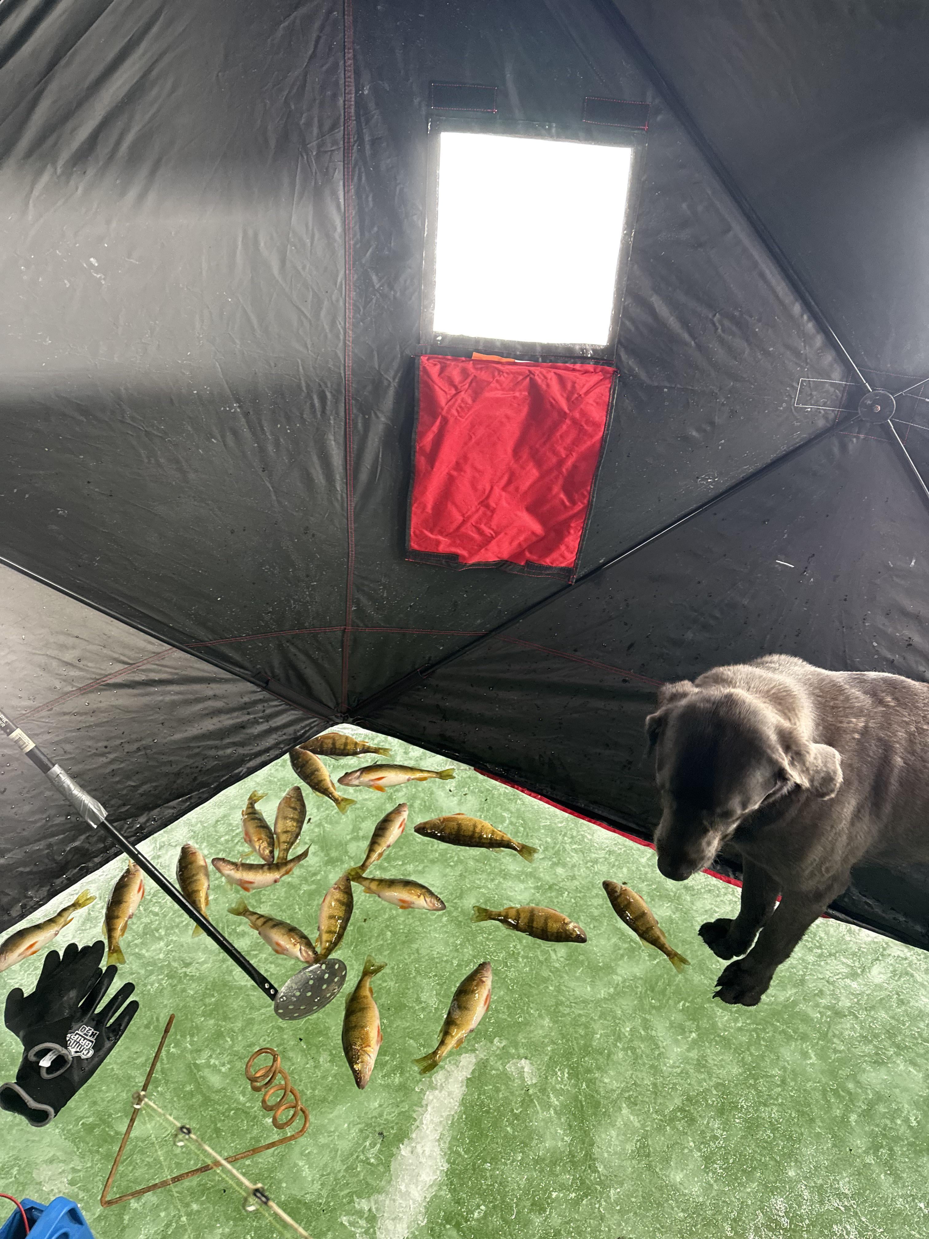 Ice fishing photo. My husband took the dog ice fishing today. I told him the fish didn't look real, as well as the tools, and even the dog, like he added everything in.