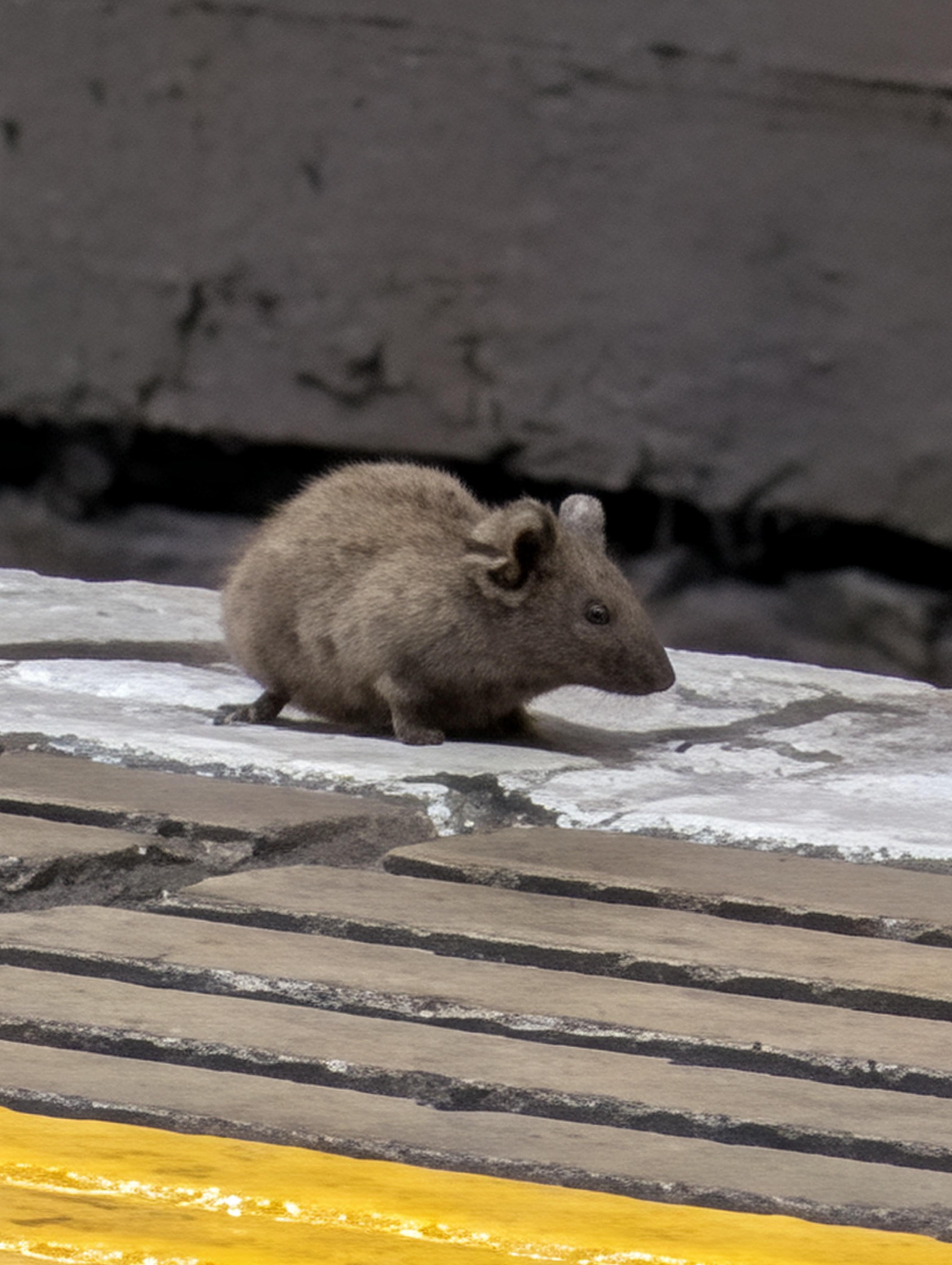 Cute little squeaker looking for crumbs on a train platform