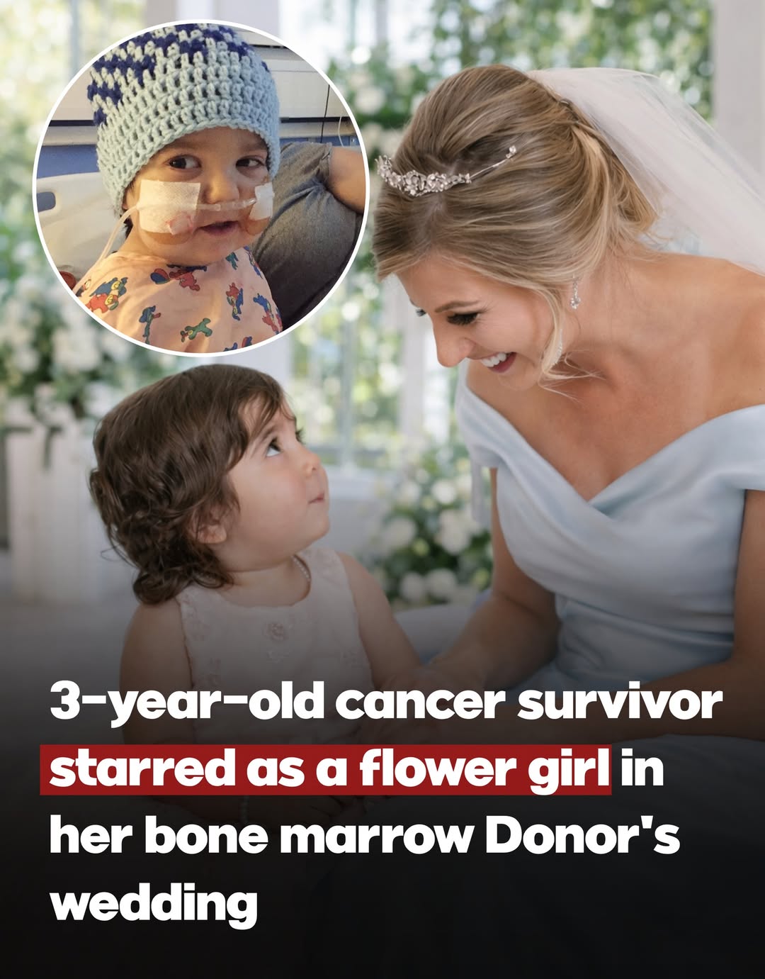 The story behind this photo stays with you long after you stop scrolling. At just three years old, a little girl survived cancer thanks to a life-saving bone marrow transplant from a donor she had never met. Months earlier, she had been in the hospital — wearing a knitted cap, connected to feeding tubes, fighting for her life. The transplant changed everything. Over time, the donor and the child’s family formed a deep bond. What began as a selfless medical decision became something far more personal. So when the donor got engaged, there was never any doubt about who would be her flower girl. On the wedding day, the same child who once lay in a hospital bed walked down the aisle in a white dress — healthy, smiling, and full of life. The photos went viral, not just because they were beautiful — but because they showed the power of one act of kindness. One donation. One saved life. And a stranger who became family.