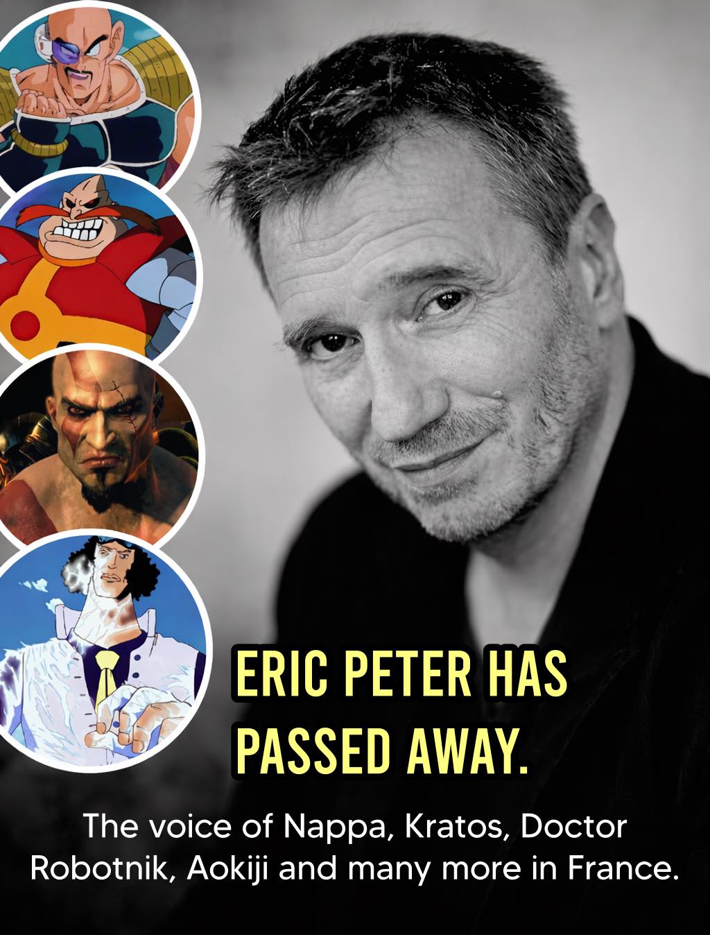 Eric Peter has sadly passed away. He was the iconic French voice behind Nappa, Kratos, Doctor Robotnik, Aokiji, and many other unforgettable characters. His talent brought countless heroes and villains to life, leaving a lasting mark on fans across generations.