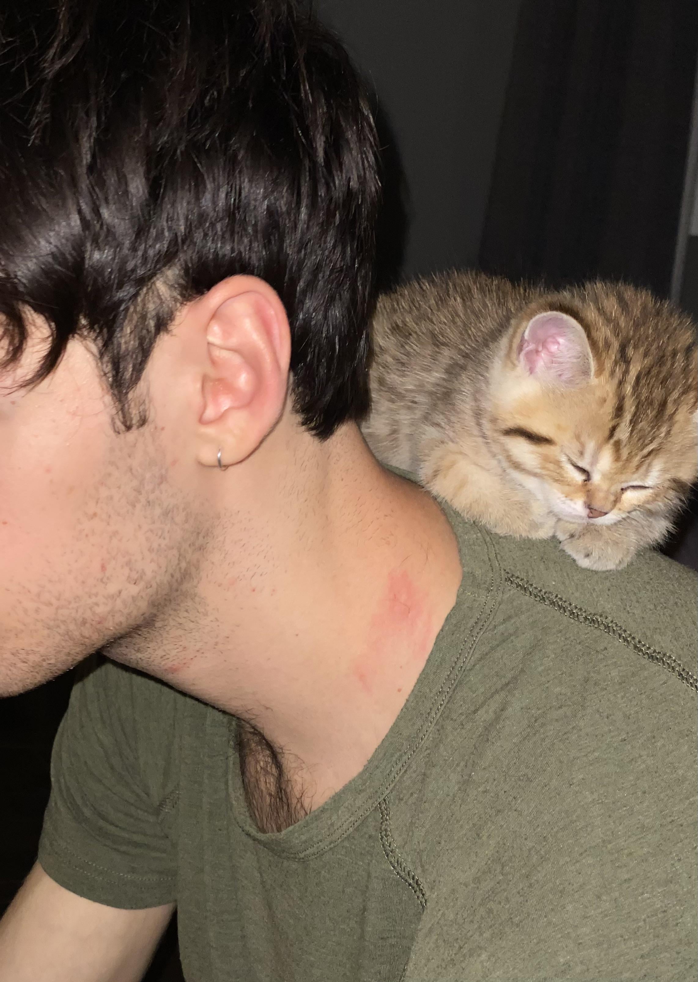 My kitten climbed on me, scratched my neck, and fell asleep