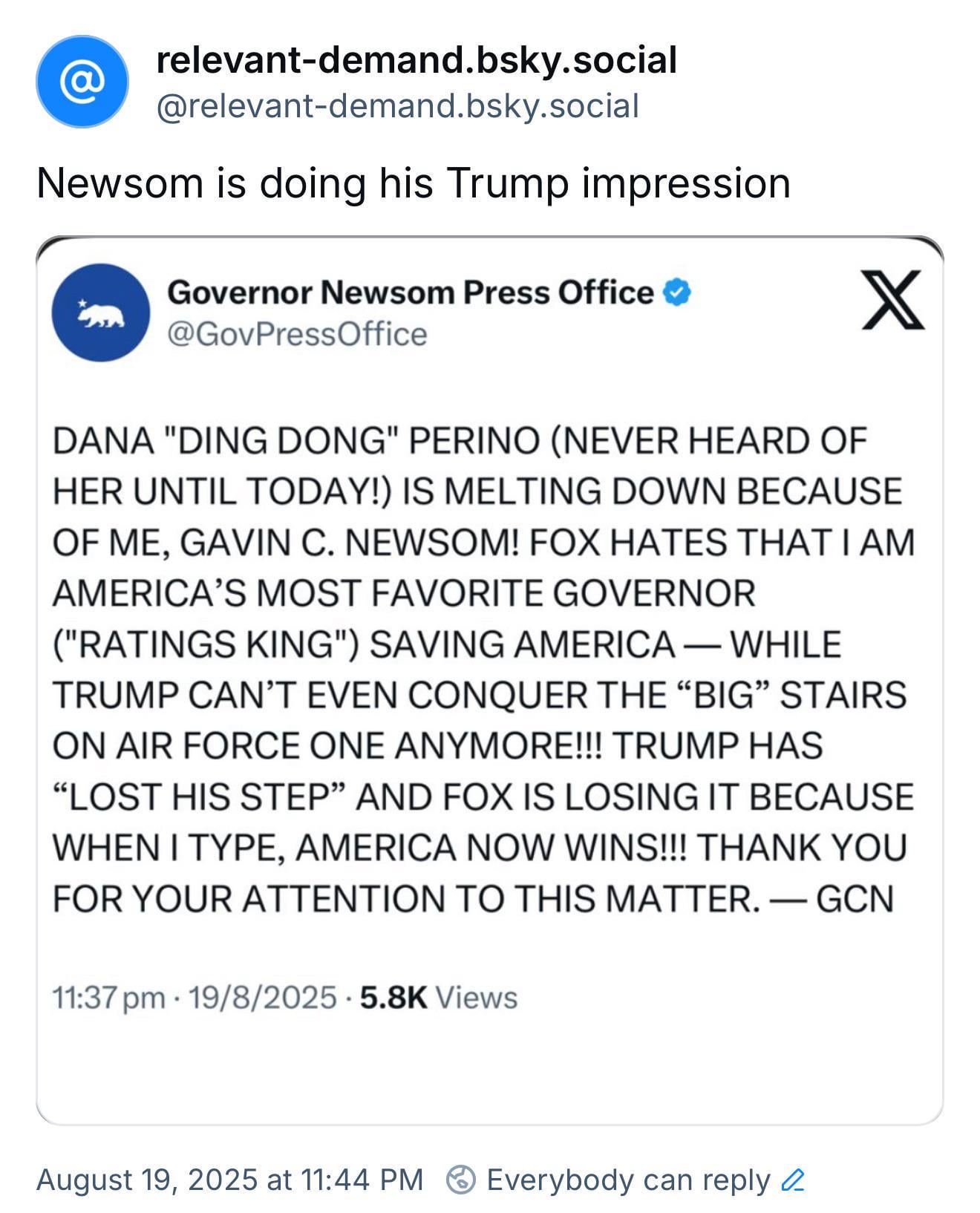 Newsom doing his Trump impression