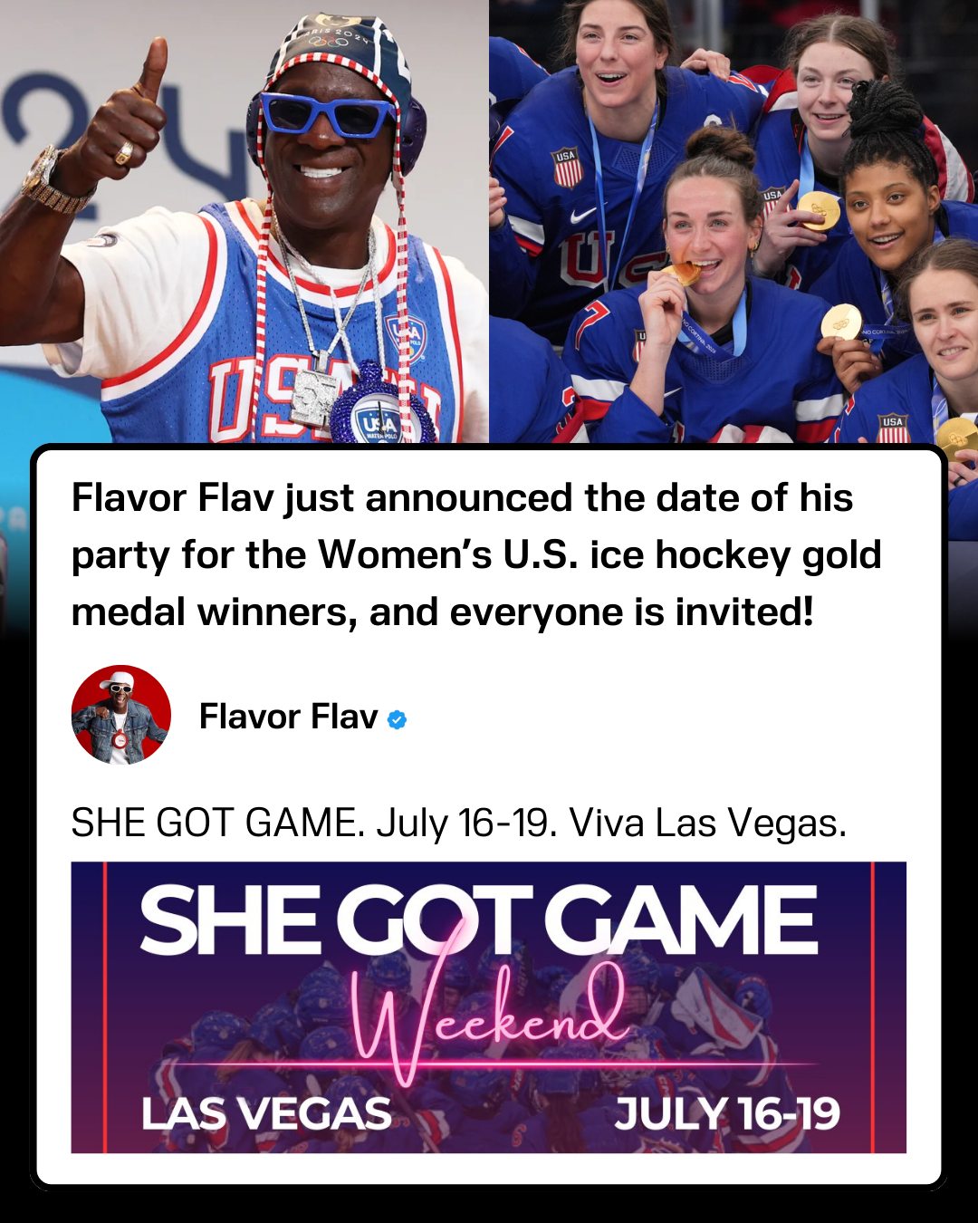 Legendary rapper Flavor Flav invited the U.S. women's ice hockey team to celebrate their gold medal with him in Vegas after they turned down the White House visit. He's announced the date, and everyone is invited. This looks like it's going to be one massive party