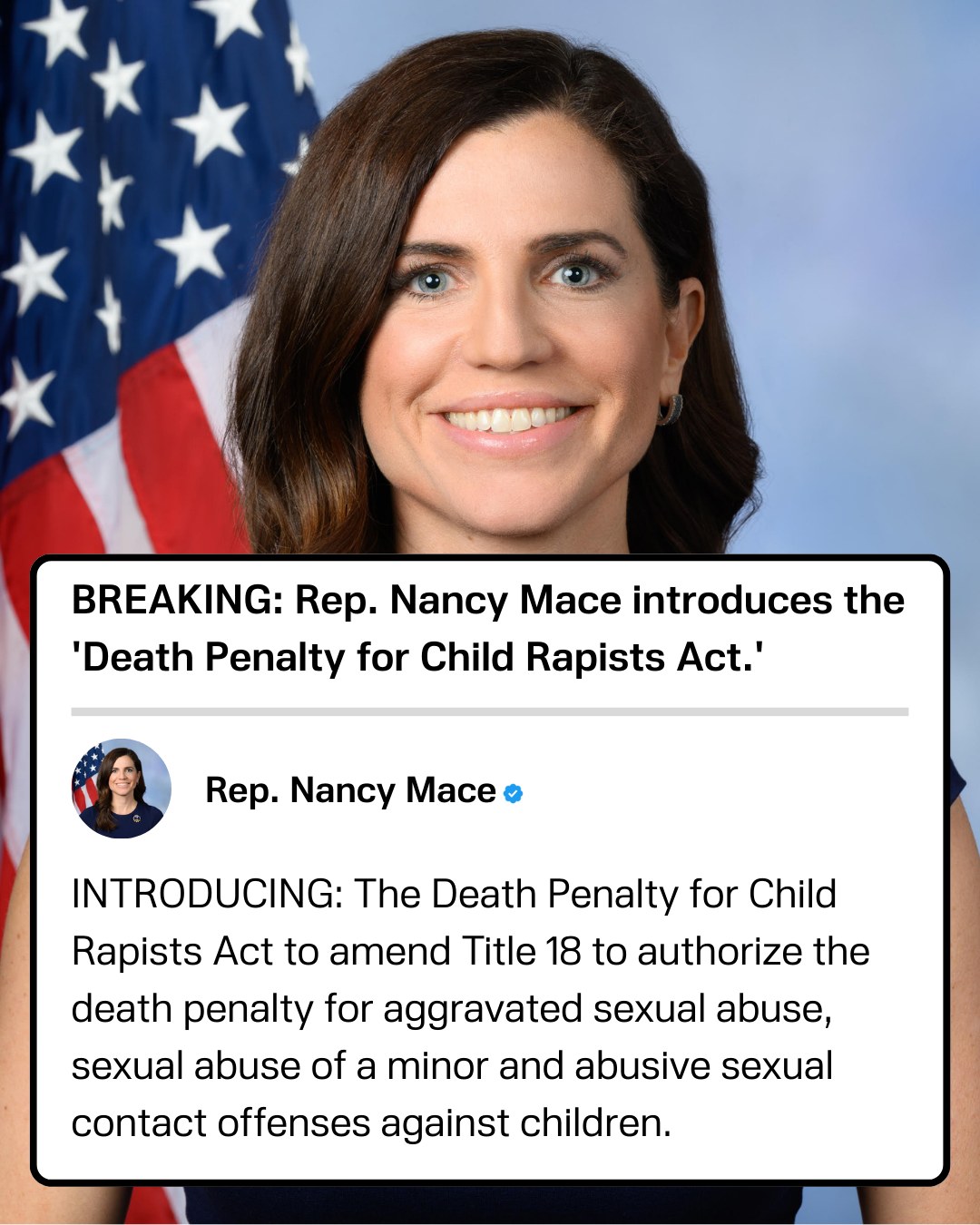 Republican Rep. Nancy Mace has just posted on her X account to introduce The Death Penalty for Child Rapists Act. She added: