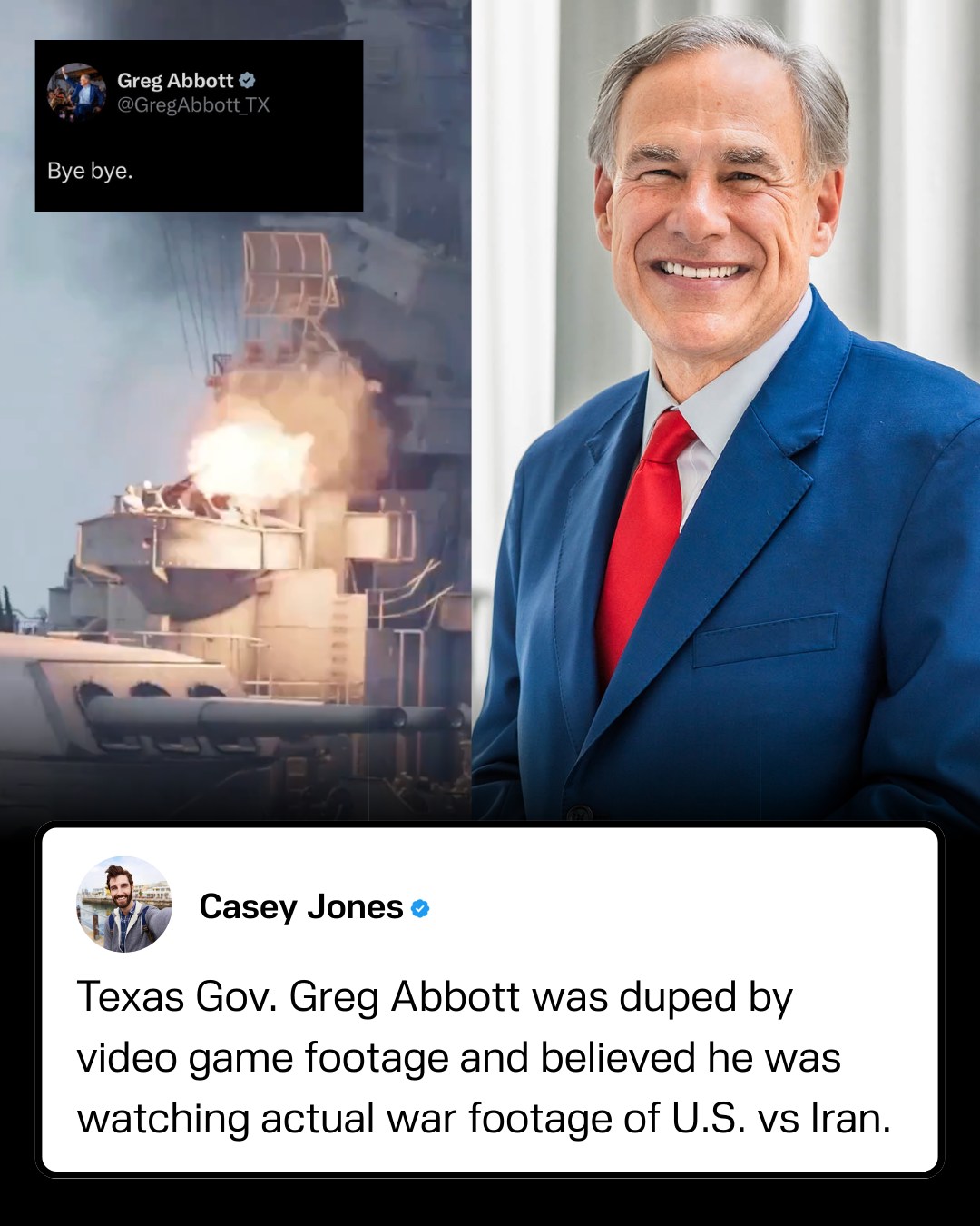 In an embarrassing post on X, Republican Gov. Greg Abbott reshared a 21-second clip that had been posted by a pro-Donald Trump account with the caption: “An Iranian plane VS a US ship." He had captioned it "Bye bye," but the footage was actually from a war simulation game.