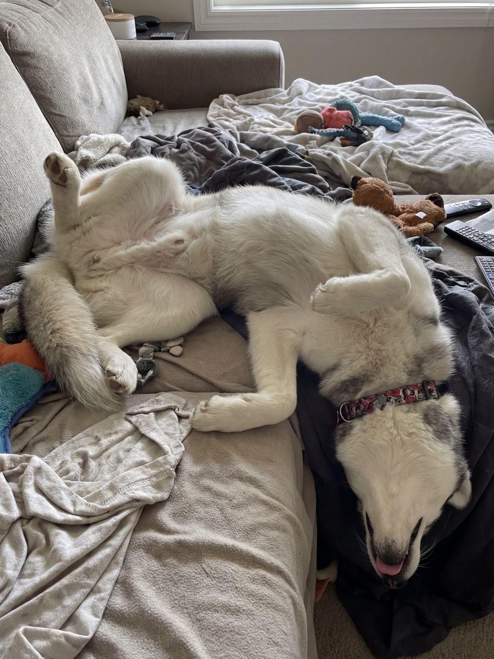 [OC] My dog's sleeping poses are getting out of hand.