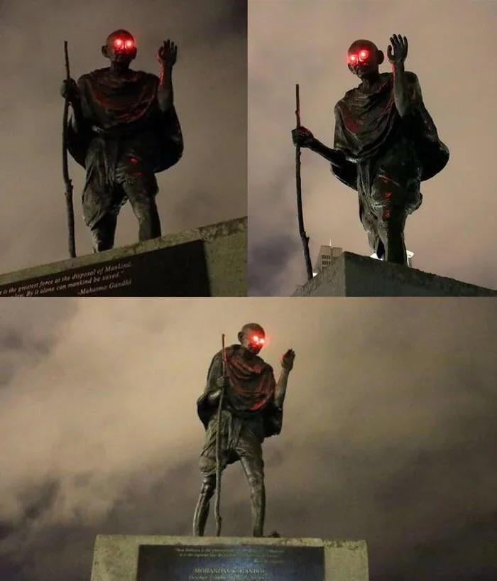 Gandhi’s statue in San Francisco after someone put red lights on it back in 2019