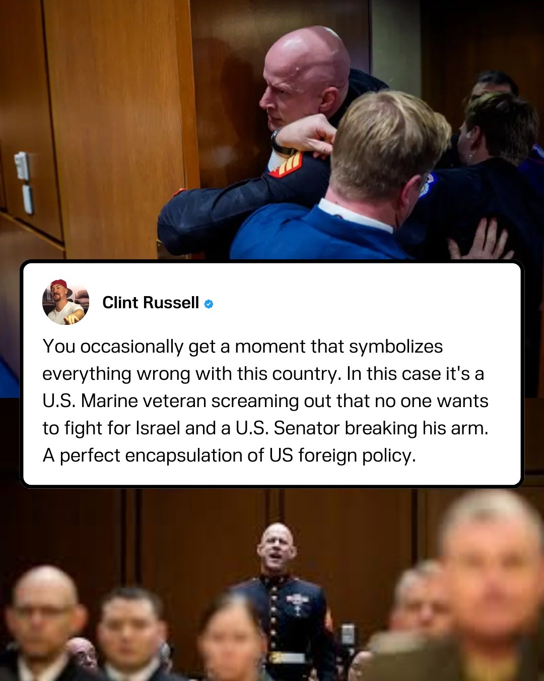 Podcaster Clint Russell says that the moment Sen. Tim Sheehy dragged veteran Brian McGinnis out of a state hearing for shouting "No one wants to die for Israel!" which resulted in Sheehy breaking McGinnis' arm symbolizes everything that is wrong with the U.S.