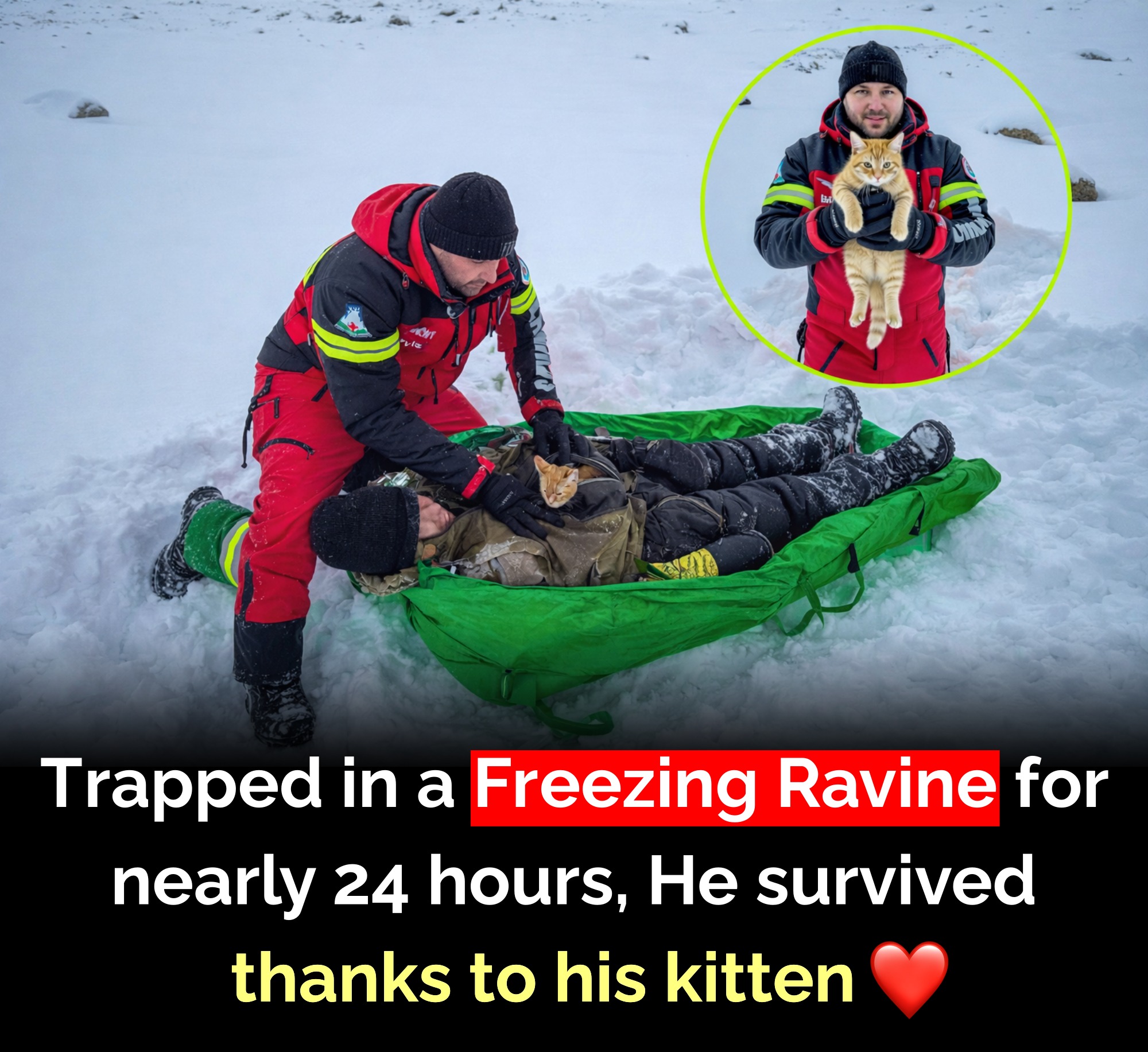 During a hiking trip, a man became trapped in a freezing ravine and spent nearly 24 hours battling harsh cold, dangerous terrain, and extreme conditions. But he wasn’t completely alone. His small kitten stayed beside him the entire time, offering warmth and comfort during the terrifying ordeal. The tiny companion helped keep his spirits up while he waited for help. Eventually, rescue teams were alerted and managed to locate him in the ravine. Emergency responders carefully pulled the man to safety, and his loyal kitten was rescued along with him. The incredible story quickly caught people’s attention, highlighting the powerful bond between humans and animals. In one of the most frightening moments of his life, the kitten’s presence gave him hope and strength to hold on. From a freezing ravine to a safe rescue, this remarkable moment shows that sometimes the smallest companions can make the biggest difference. Truly, some heroes come with fur.