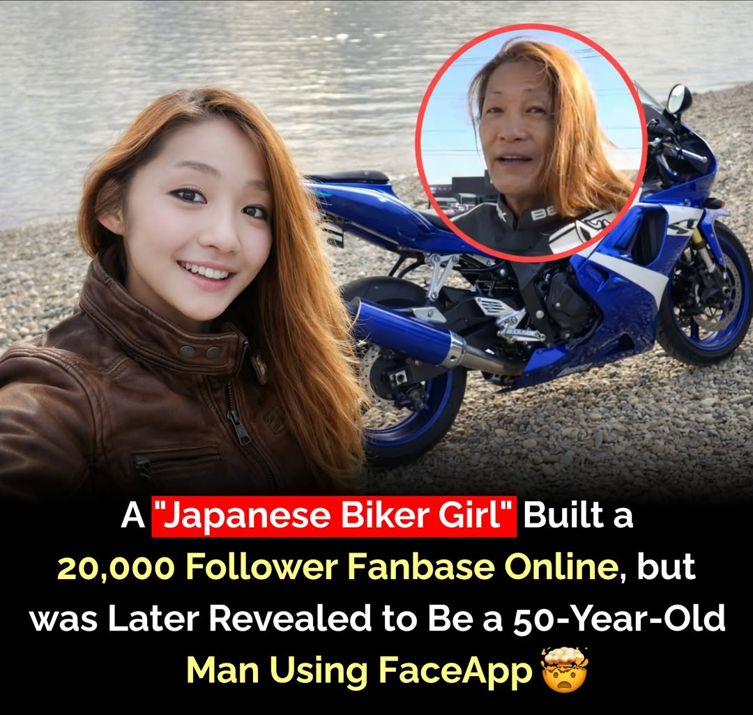 A Japanese social media account that appeared to belong to a young female motorcycle rider quickly grabbed attention online . The profile regularly posted cheerful selfies with bikes and travel-style photos, building a fanbase of over **20,000 followers** who loved the biker lifestyle aesthetic . Over time, some viewers started noticing small inconsistencies in certain pictures. Sharp-eyed followers spotted strange reflections in motorcycle photos that didn’t quite match the youthful “biker girl” identity . These tiny details sparked curiosity about who was actually behind the account. The mystery was eventually revealed on Japanese television . The viral “biker girl” persona turned out to be a **man in his 50s** who had been using **FaceApp and other photo-editing tools** to transform his appearance into a younger, feminine look online . In interviews, he explained that the goal was mainly to gain attention and engagement, admitting that a typical middle-aged man posting motorcycle photos probably wouldn’t attract the same interest on social media . The reveal quickly went viral and sparked discussions about how powerful modern filters and editing apps have become — and how easily a convincing online identity can be created in today’s digital world .