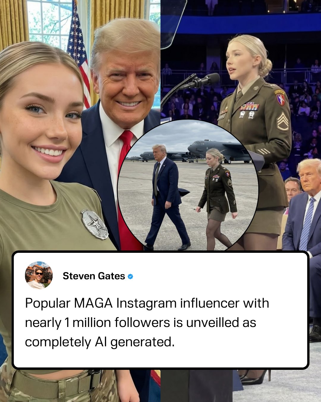 A popular MAGA Instagram influencer with nearly 1 million followers, known as Jessica Foster, has been revealed to be entirely AI-generated. The account, which posted staged photos portraying her as an “American army girl” and even interacting with world leaders, has no real identity or military background behind it. Creators appear to have monetized the persona.