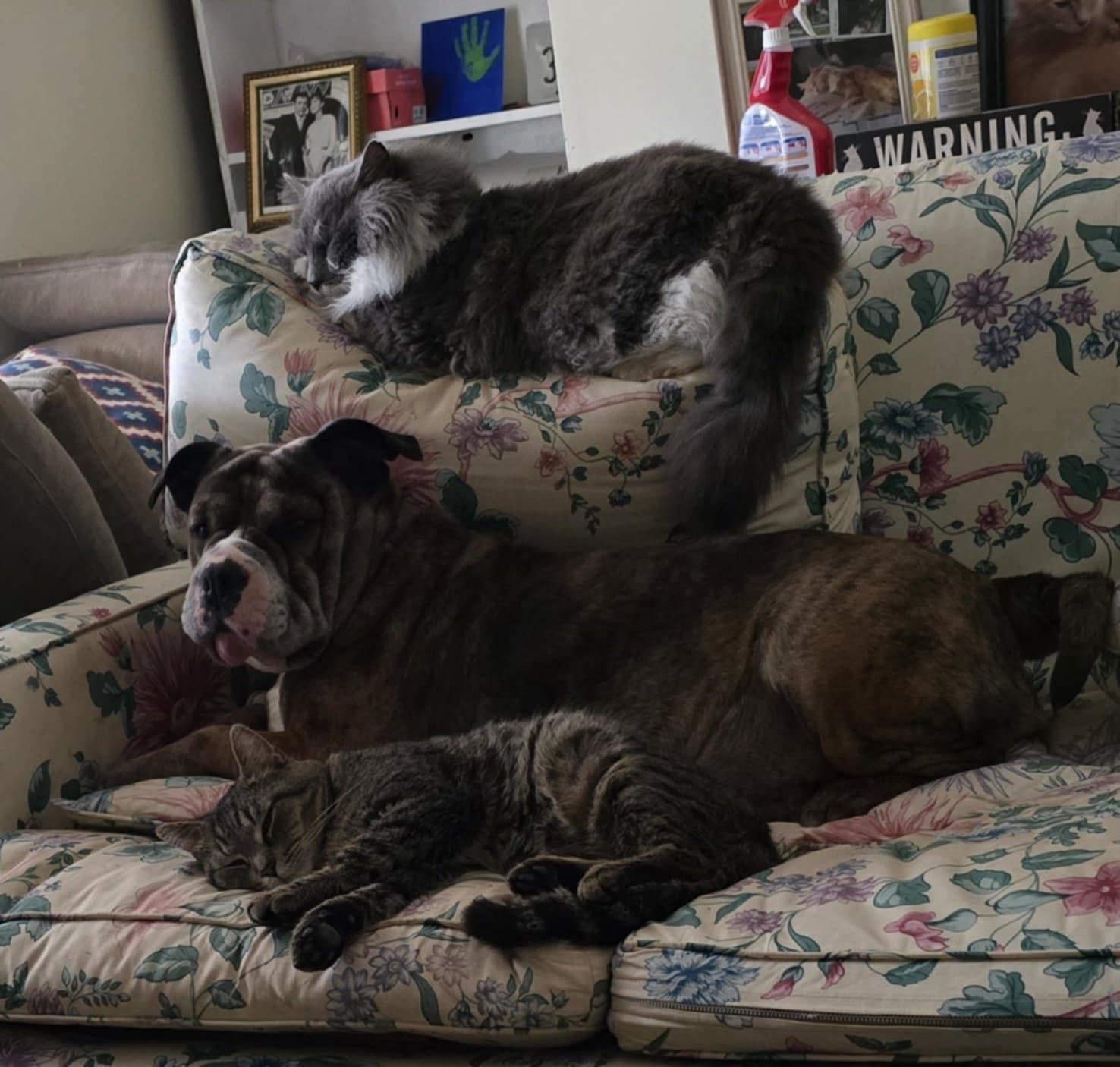 Merrick (Top Cat) D.Va (Dog) and Hamburger (bottom cat)