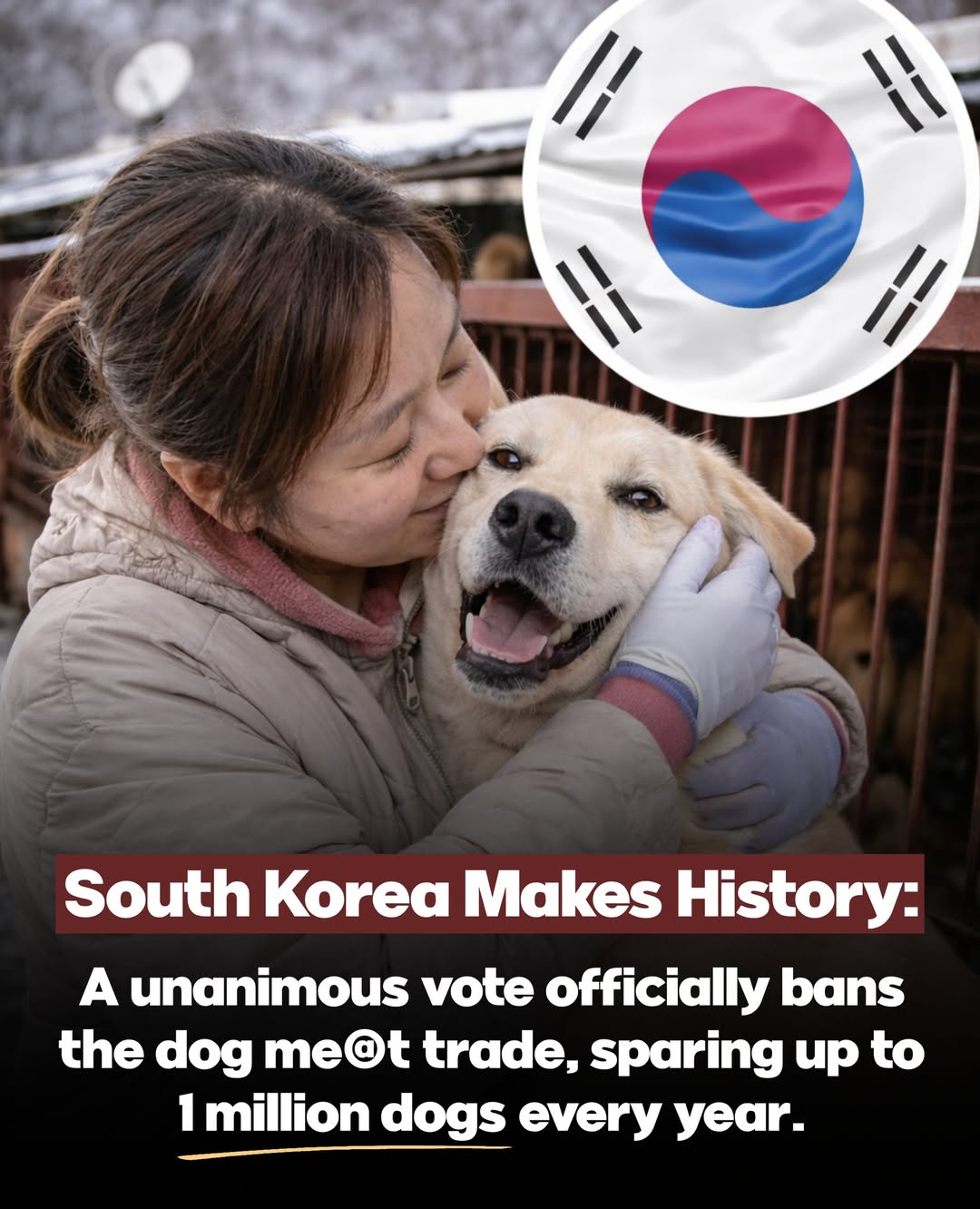 In a historic move for animal welfare, South Korea’s National Assembly voted 208–0 on January 9, 2024, to ban the breeding, slghter, and sale of dogs for human consumption. The decision signals the end of a centuries-old practice that has faced growing opposition from younger generations who increasingly see dogs as pets rather than food. The new law includes a three-year transition period, giving farmers and restaurant owners time to move to other livelihoods. Full enforcement — including penalties of up to three years in prison — will begin in February 2027. Activists estimate that nearly one million dogs were previously factory-farmed and k**led each year for the industry. To support the transition, the government is offering subsidies and assistance to more than 1,100 dog farms and thousands of restaurants affected by the ban. Animal welfare groups are also working to rescue and rehome hundreds of thousands of dogs still on farms. For many observers, the decision marks a major cultural shift — and a significant step forward for animal protection worldwide.
