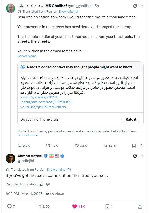 Iranian speaker of the parliament calls for citizens to go out on the streets and serve as human shields