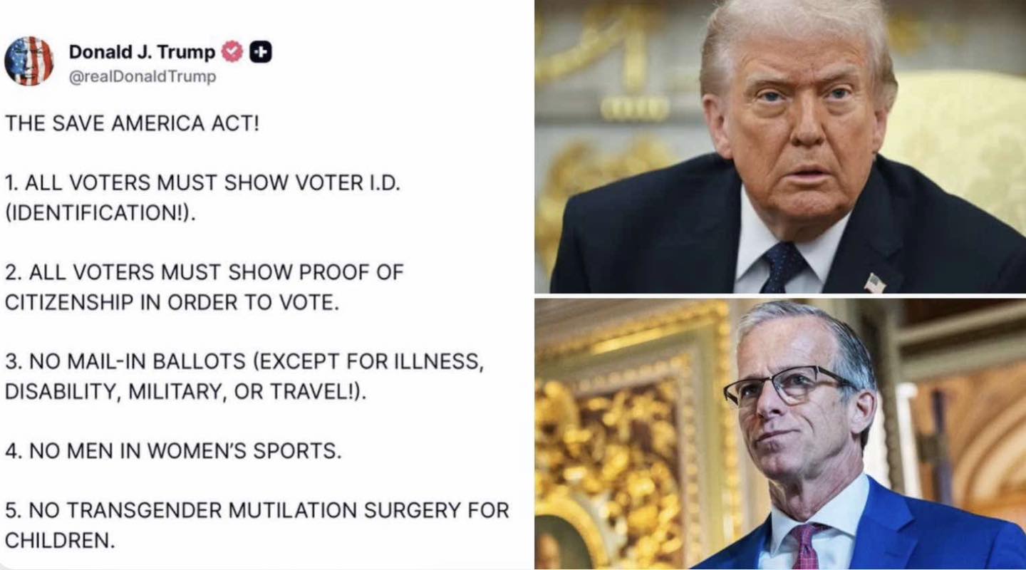 Tổng thống Trump YÊU CẦU các Thượng nghị sĩ Đảng Cộng hòa NHANH CHÓNG thông qua Đạo luật CỨU nước Mỹ Ông Trump cũng yêu cầu Quốc hội KHÔNG được thông qua bất kỳ đạo luật nào về phẫu thuật cắt bỏ bộ phận sinh dục của trẻ em, DƯỚI BẤT KỲ HOÀN CẢNH NÀO! "ĐẠO LUẬT CỨU NƯỚC MỸ!" 1. TẤT CẢ CỬ TRI PHẢI XUẤT TRÌNH THẺ CỬ TRI (GIẤY TỜ TÙY THÂN!). 2. TẤT CẢ CỬ TRI PHẢI XUẤT TRÌNH GIẤY TỜ CHỨNG MINH QUỐC TỊCH ĐỂ ĐƯỢC BỎ PHIẾU. 3. KHÔNG CHẤP NHẬN PHIẾU BẦU QUA THƯ (NGOẠI TRỪ TRƯỜNG HỢP ỐM ĐAU, KHUYẾT TẬT, QUÂN ĐỘI HOẶC DU LỊCH!). 4. KHÔNG CÓ NAM GIỚI THAM GIA CÁC MÔN THỂ THAO DÀNH CHO NỮ. 5. KHÔNG THỰC HIỆN PHẪU THUẬT CẮT BỎ BỘ PHẬN SINH DỤC ĐỂ CHUYỂN GIỚI Ở TRẺ EM. Ông Trump đang thúc đẩy Quốc hội hành động vì hàng triệu người Mỹ muốn có những biện pháp bảo vệ hợp lý cho các cuộc bầu cử và cho trẻ em. Chương trình nghị sự "Nước Mỹ trên hết" không hề chậm lại, và những người ủng hộ sẵn sàng chứng kiến ​​các chính sách này được thông qua Những phát ngôn của Trump nhấn mạnh nỗ lực quyết liệt của ông trong việc định hình cương lĩnh của đảng Cộng hòa năm 2026, đồng thời thể hiện lập trường không thỏa hiệp về các ưu tiên chính sách quan trọng của mình. Đây là một số dự luật đã bị bác bỏ tại Thượng viện vì lãnh đạo Thượng viện của chúng ta từ chối thông qua luật xác minh danh tính cử tri!