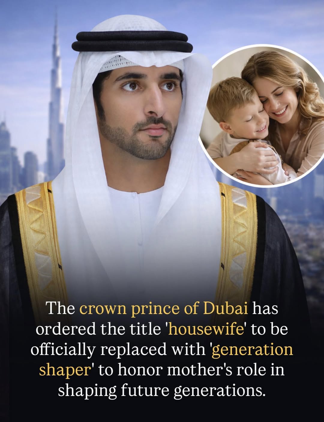 Sheikh Hamdan bin Mohammed Al Maktoum, Crown Prince of Dubai, made headlines with a heartfelt idea that resonated across the United Arab Emirates. He proposed replacing the title “housewife” with something far more meaningful: “Generation Shaper” Because, as he explained, “housewife” only describes where a woman is… But “Generation Shaper” reflects what she truly does — raising children, building values, and shaping the future. The idea was shared as part of a broader Mother’s Day tribute, recognizing mothers as the foundation of families and society. Not just caregivers Not just at home But nation-builders influencing the next generation. It’s more than a name change. It’s a reminder that the work of mothers isn’t ordinary… it shapes the future of entire generations.