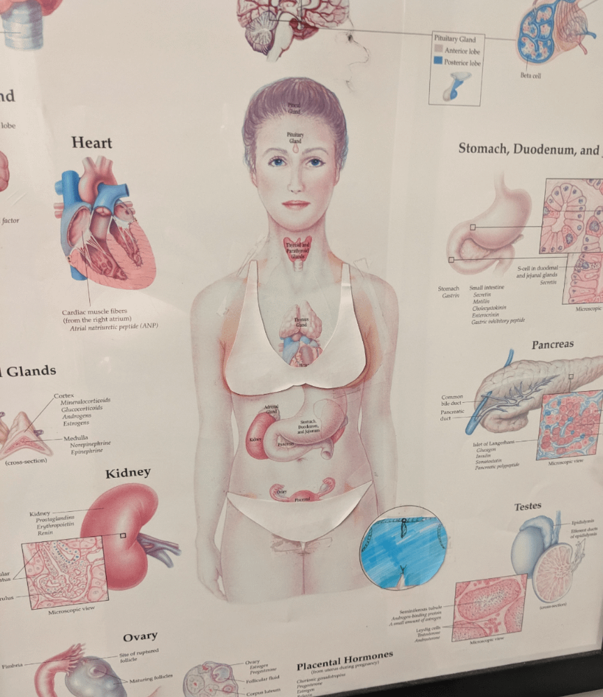 Someone at my doctor's office made a paper bikini to censor this medical illustration.