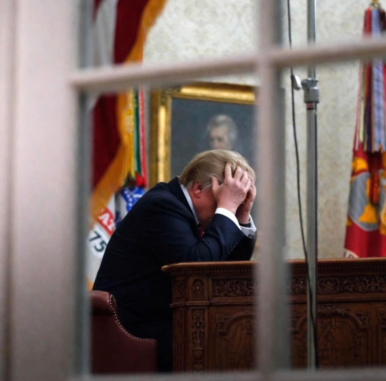 Donald Trump sitting at a desk with his head in his hands.