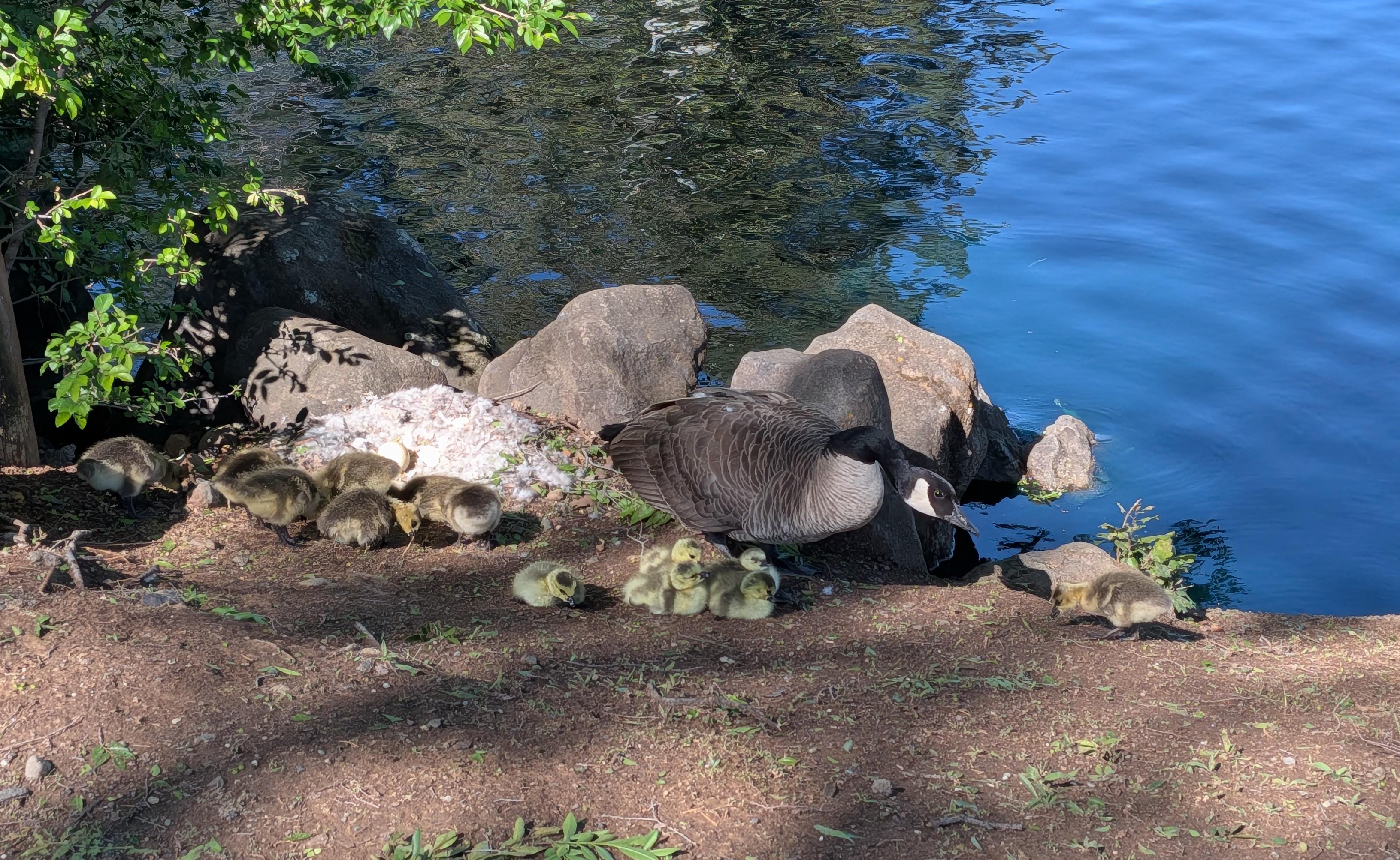 Only the little ones next to her are hers. I'm not sure about the other goslings by the nest.