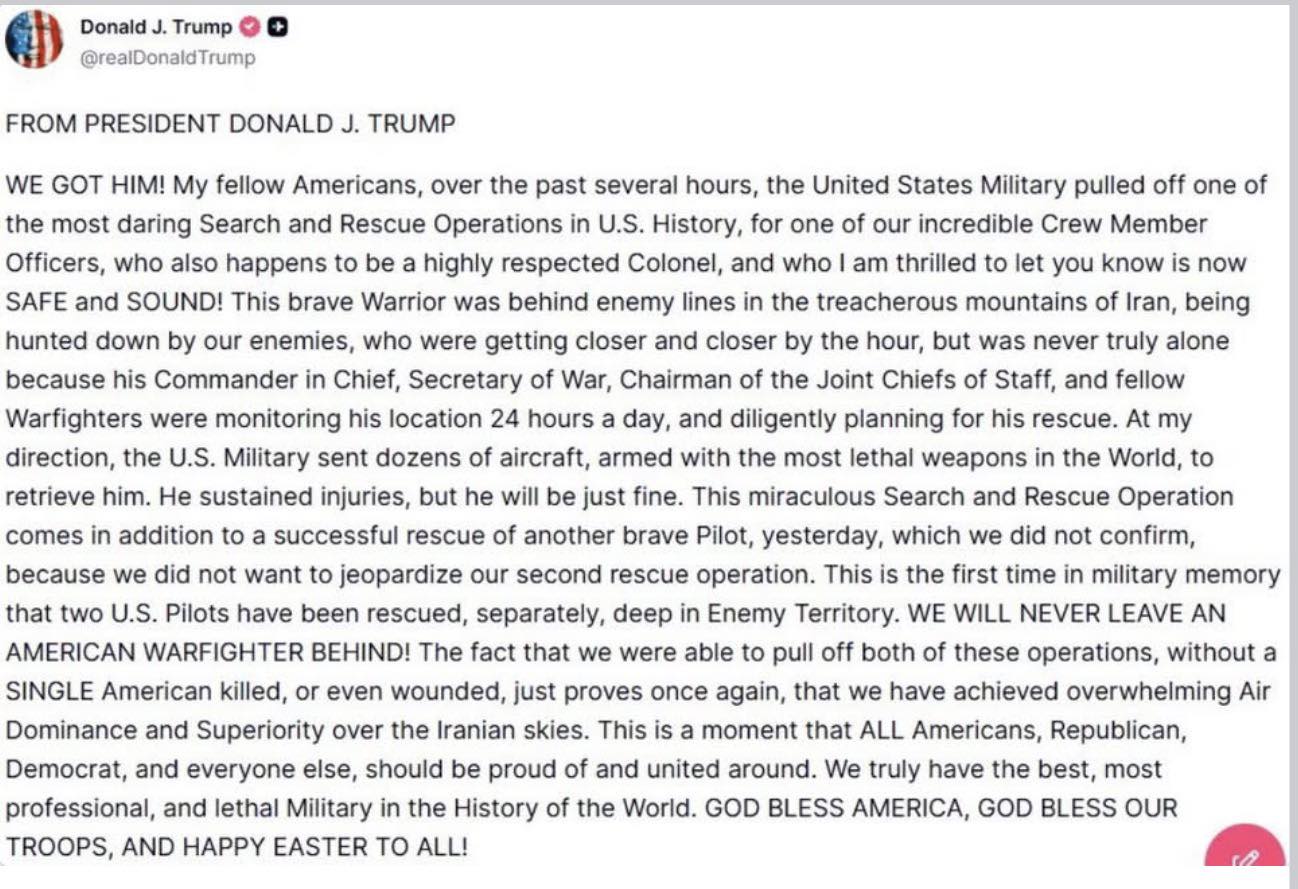 Tổng thống Trump tuyên bố một quân nhân Mỹ đã được giải cứu khỏi Iran, cho biết chiến dịch đã được thực hiện mà không có người Mỹ nào thiệt mạng hoặc bị thương. "Trong vài giờ qua, quân đội Hoa Kỳ đã thực hiện một trong những chiến dịch Tìm kiếm và Giải cứu táo bạo nhất trong lịch sử Hoa Kỳ."