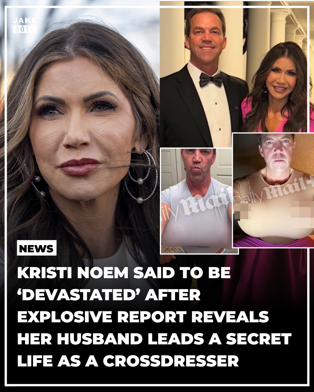 A bombshell report published today has thrust Kristi Noem — former U.S. Secretary of Homeland Security and long‑time GOP figure — back into the spotlight, but this time because of allegations about her husband’s private life. According to a Daily Mail‑sourced exposé, her husband Bryon Noem has allegedly been living a secret online life, including sending messages and photos to adult performers while cross‑dressing in provocative attire such as tight pink shorts and what appear to be balloon‑like prosthetic breasts. The report says Bryon exchanged hundreds of messages with three women in the so‑called “bimbofication” community and even sent them tens of thousands of dollars.