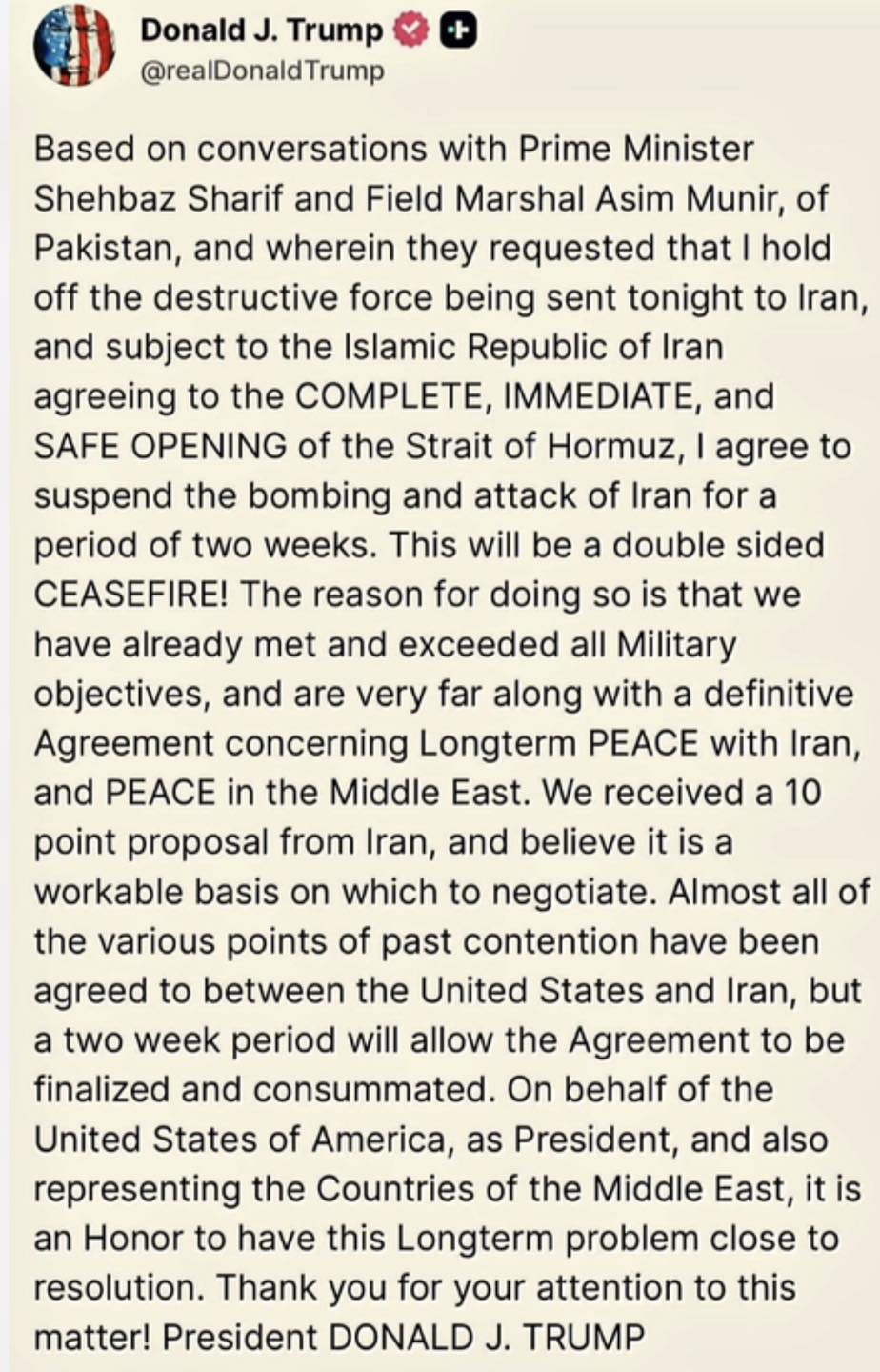 Theo Fox New loan tin rằng : Một thỏa thuận ngừng bắn "dự kiến sẽ được hoàn tất tối nay". Pakistan đề xuất tạm ngừng bắn hai tuần với việc Iran mở lại eo biển Hormuz. Iran cho biết họ đang "xem xét tích cực" đề xuất này.