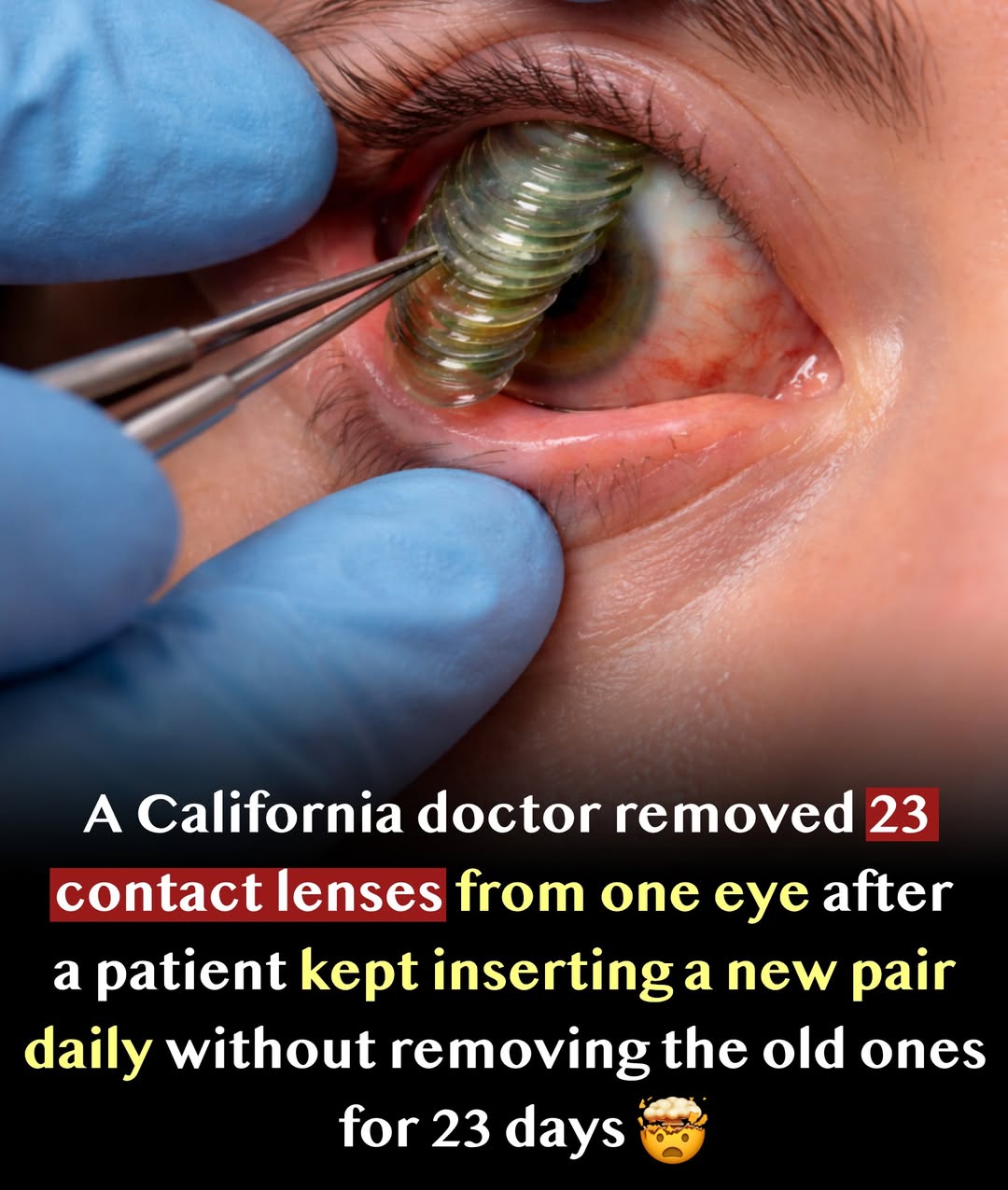 A shocking medical case from California revealed that a doctor removed 23 contact lenses from a single eye of a patient. The patient had been unknowingly placing a new pair of lenses every morning without removing the previous ones for 23 consecutive days. Over time, the lenses accumulated, causing discomfort and potential risk to the eye. When discovered, the situation surprised even medical professionals. Thankfully, despite the unusual and risky condition , the patient was treated successfully and recovered without any permanent damage , highlighting the importance of proper eye care and hygiene .A shocking medical case from California revealed that a doctor removed 23 contact lenses from a single eye of a patient. The patient had been unknowingly placing a new pair of lenses every morning without removing the previous ones for 23 consecutive days. Over time, the lenses accumulated, causing discomfort and potential risk to the eye. When discovered, the situation surprised even medical professionals. Thankfully, despite the unusual and risky condition , the patient was treated successfully and recovered without any permanent damage , highlighting the importance of proper eye care and hygiene .0 Commentaires 0 Parts 47 Vue 0 Aperçu