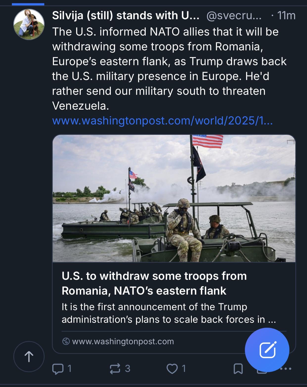 The U.S. informed NATO allies that it will be withdrawing some troops from Romania, Europe’s eastern flank, as Trump draws back the U.S. military presence in Europe. He'd rather send our military south to threaten Venezuela.The U.S. informed NATO allies that it will be withdrawing some troops from Romania, Europe’s eastern flank, as Trump draws back the U.S. military presence in Europe. He'd rather send our military south to threaten Venezuela.· 0 Комментарии ·0 Поделились ·61Кб Просмотры ·0 предпросмотр