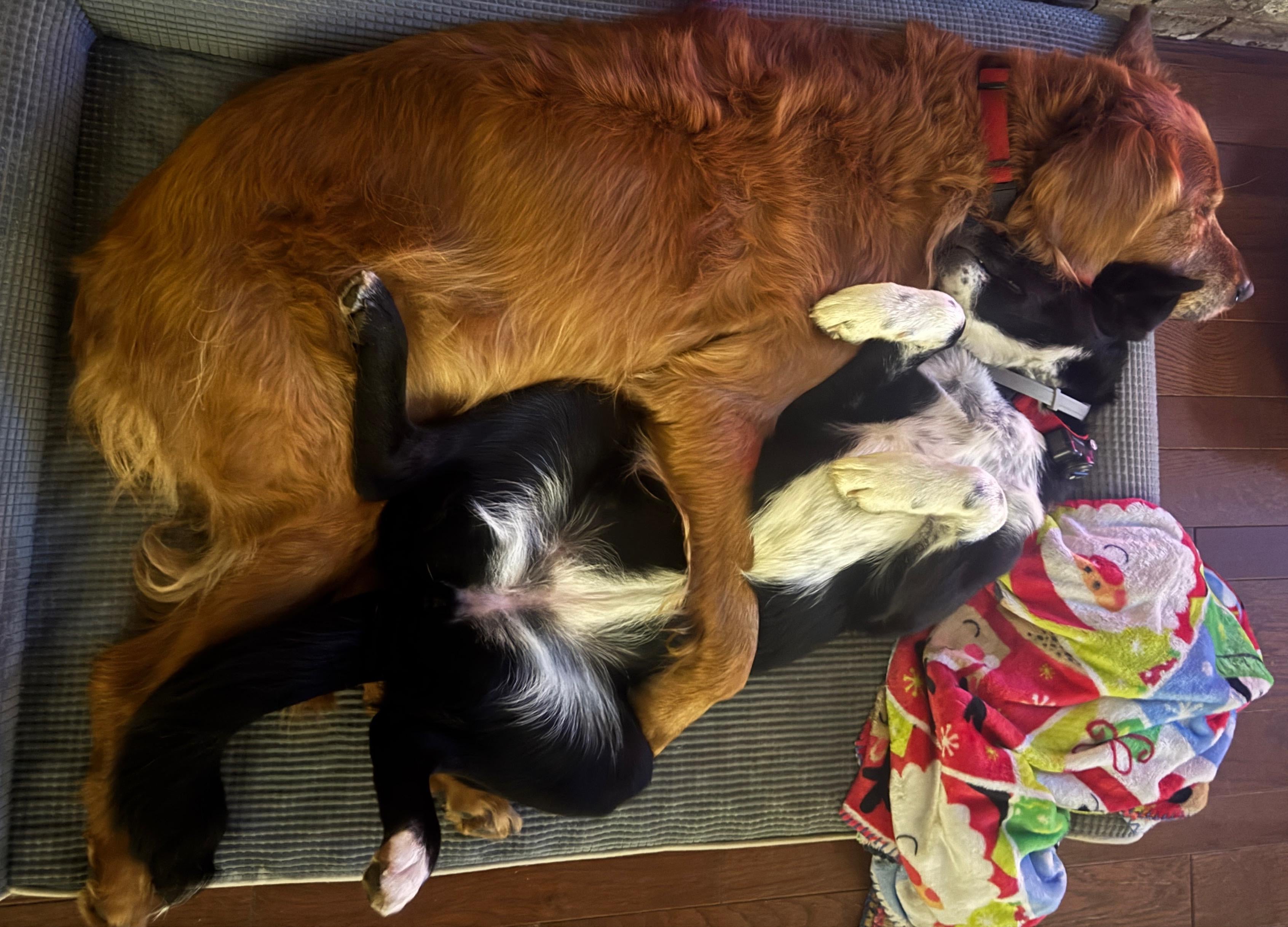 My puppy and my old dog snuggling