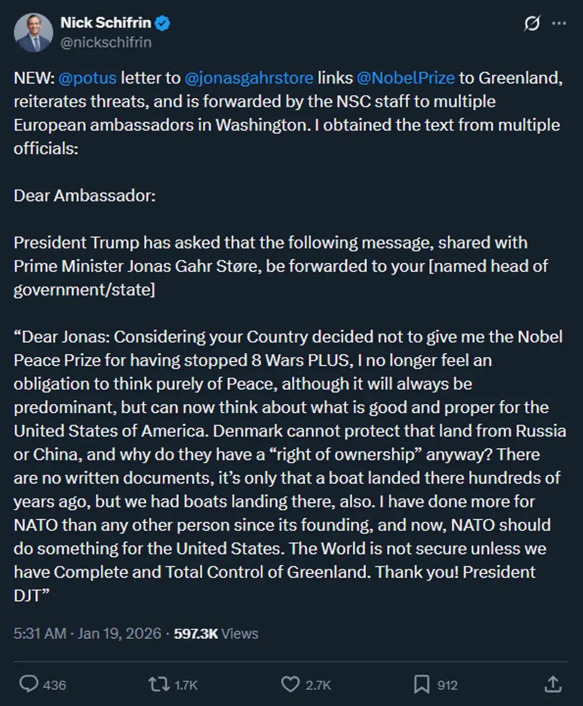 Trump letter to Norwegian PM Støre regarding the Nobel Peace Prize and Greenland today:Trump letter to Norwegian PM Støre regarding the Nobel Peace Prize and Greenland today:0 التعليقات 0 المشاركات 111كيلو بايت مشاهدة 0 معاينة